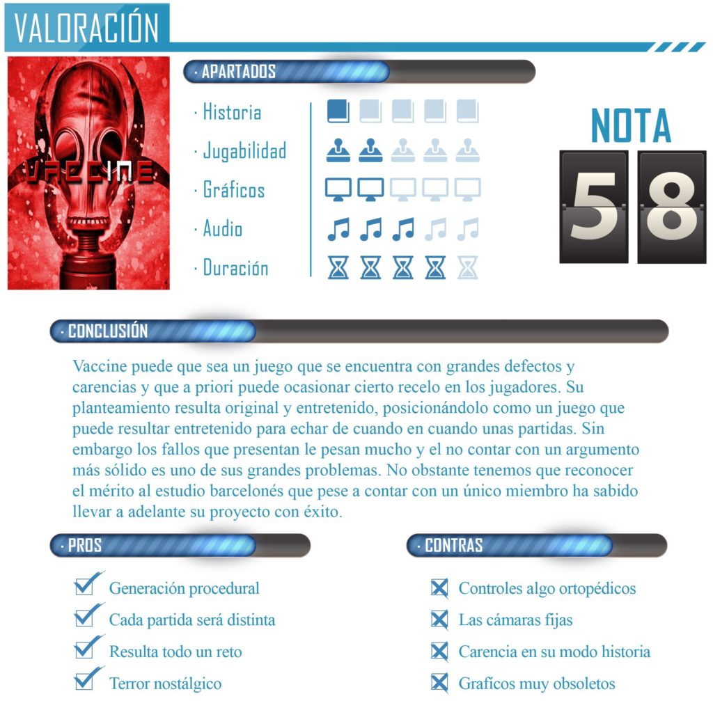 Tenemos que concluir este apartado hablando de las posibilidades que Vaccine podría haber ofrecido en cuanto a su argumento que no se han visto aprovechadas. Quedan muchos fans aficionados al terror y la supervivencia clásicas y el hecho de ambientar el juego en una mansión plagada de peligros y con la presencia de dos personajes podría haber dado para crear una historia redonda alrededor de ellos, sin embargo esta es meramente anecdótica en Vaccine ya que se nos presentará nuestro objetivo al principio de la partida por medio de pantallas con textos.