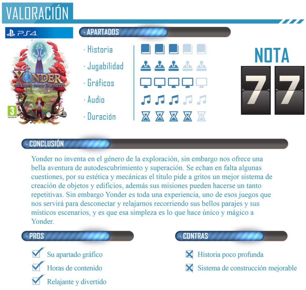 Como podemos ver Yonder nos presenta un argumento un poco típico y muy común en este género, sin embargo la belleza de la obra de Prideful no necesita una historia mucho más compleja ya que su verdadero atractivo reside en sus bellos escenarios y en proporcionarnos una experiencia de exploración total en una isla que nos robará el corazón.