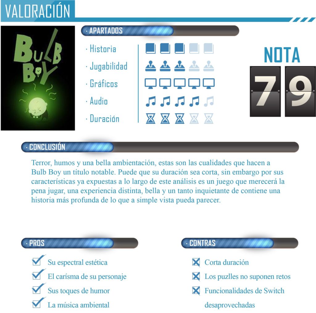 Bulb Boy se puede completar perfectamente en unas 4 o 5 horas, una duración no muy elevada que viene a ser el resultado de su baja dificultad. Sin embargo hay un punto negativo en cuanto sus mecánicas que tenemos que señalar y es el que no se ha aprovechado las funciones táctil de la pantalla de Nintendo Switch, algo que le viene como anillo al dedo en este título y más si tenemos en cuenta que presenta mecánicas Point & Click.