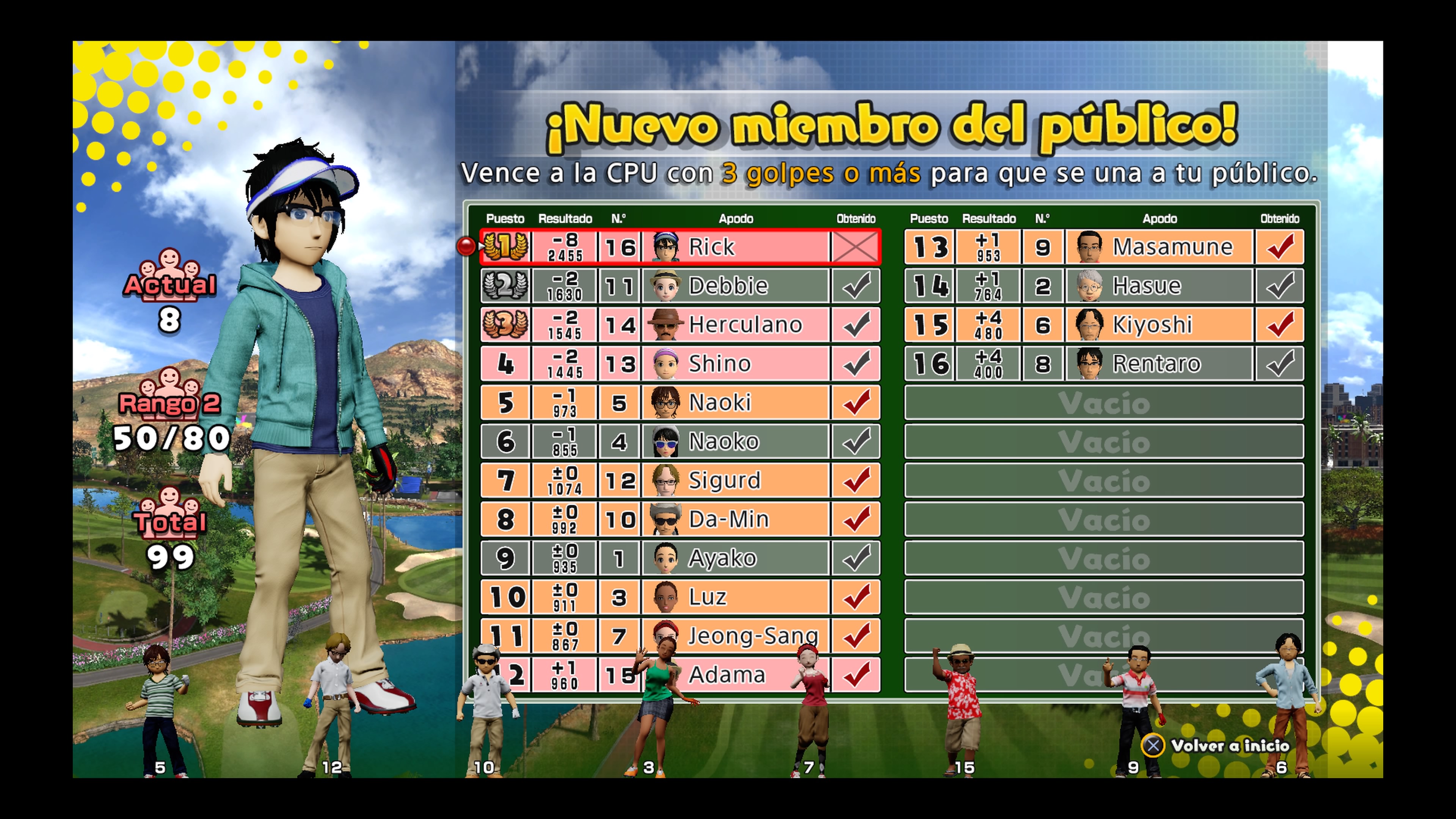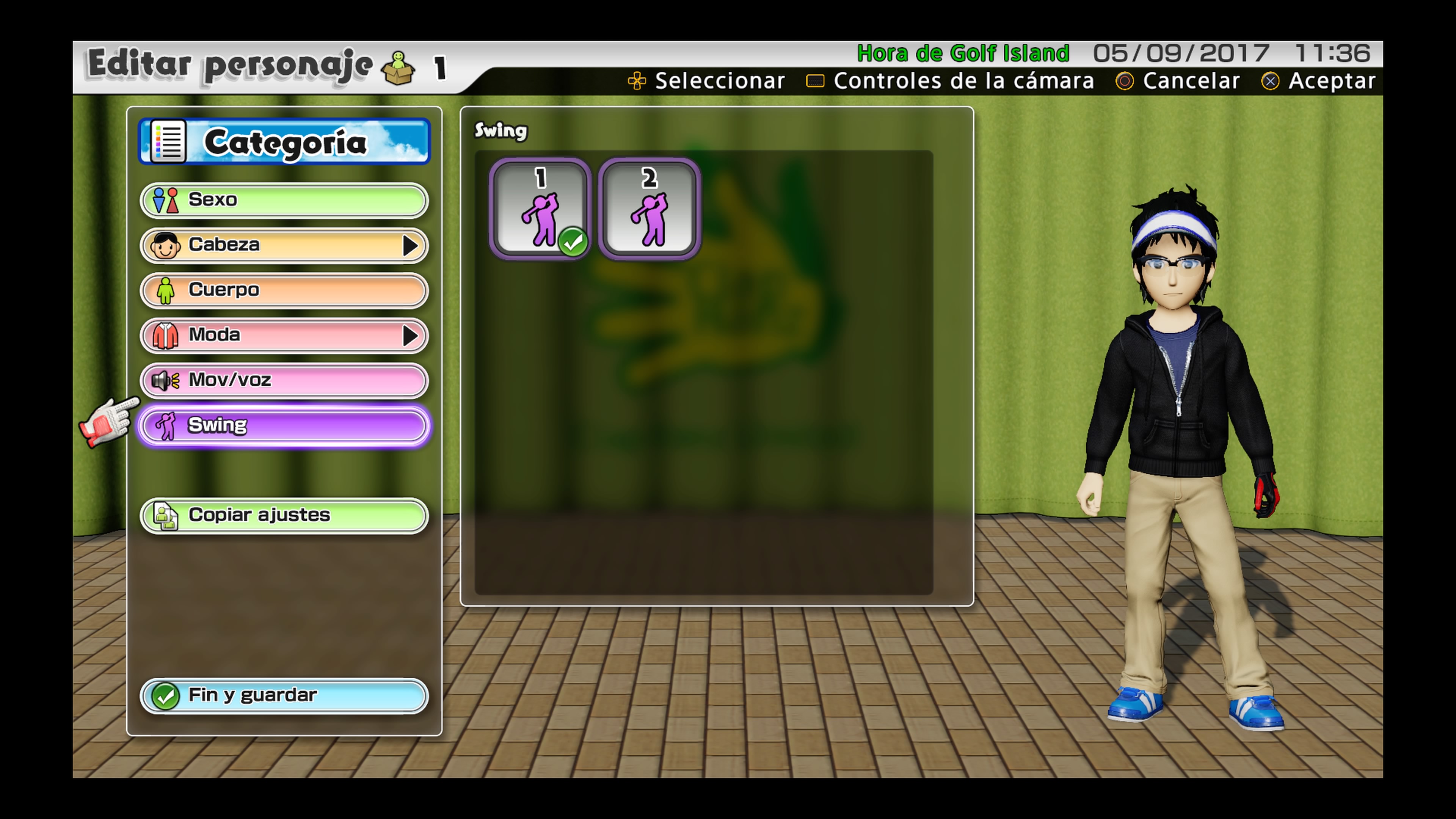 Prescindiendo de historia, ya que en muchos juegos deportivos no la encontramos y en Everybody´s Golf tampoco está presente, lo primero que tenemos que señalar es el modo un jugador, aquí nuestro primer objetivo será crearnos nuestro avatar a través de un editor bastante completo, todo hay que decirlo, ya que podemos seleccionar entre una serie de parámetros bien definidos para dar a nuestro personaje el aspecto que queramos. Pero si no queremos complicarnos con esto siempre podemos utilizar alguno generado de forma automática, aunque no tendrá la misma personalidad que el que podamos realizar nosotros. De aquí también tenemos que destacar que no será únicamente nuestro aspecto físico el que podamos customizar, sino también la ropa con la que vistamos, nuestra voz y nuestro swing, característica que no podría faltar en un juego que tiene por bandera el deporte del golf.