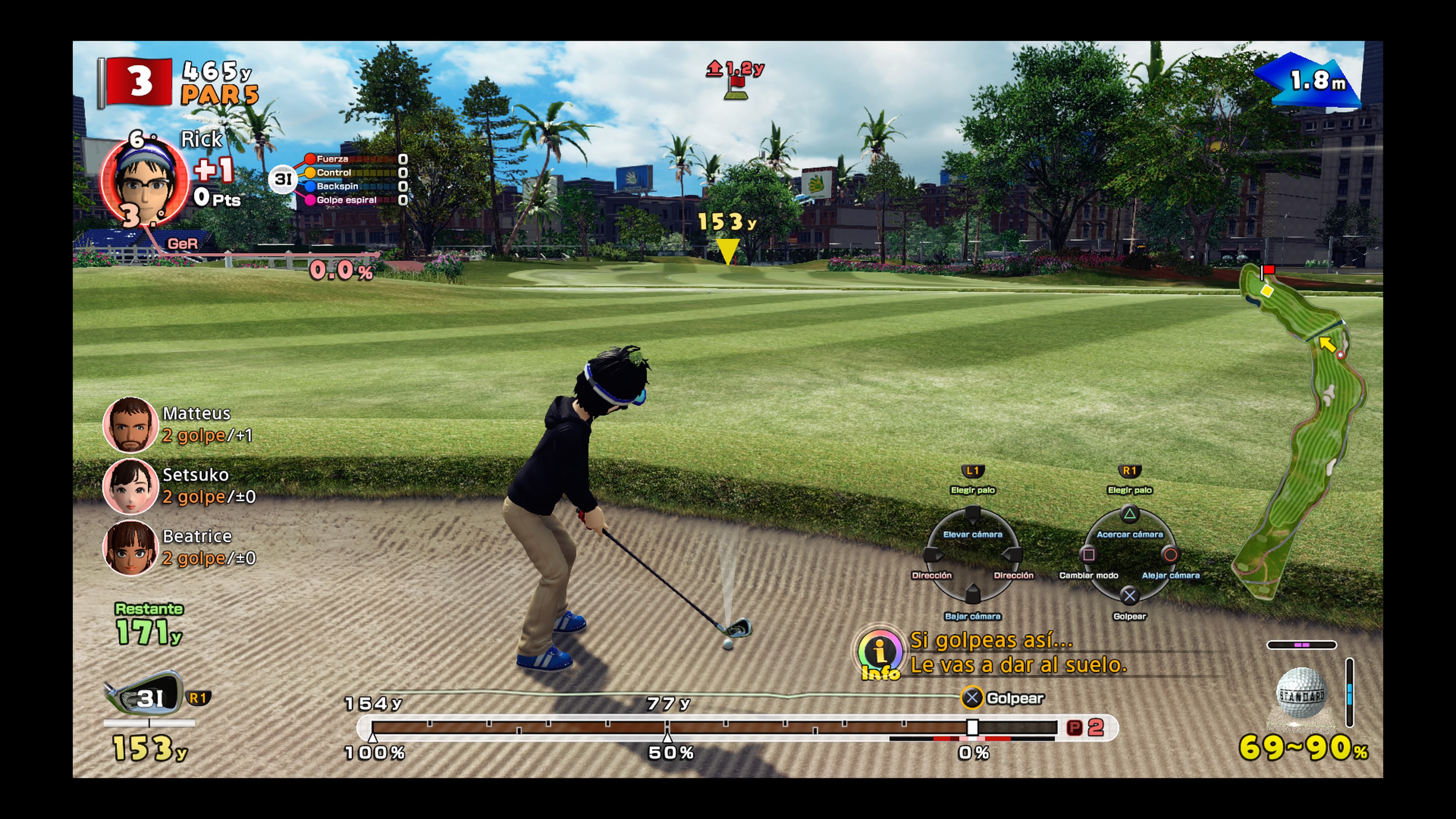 Jugar al golf será más fácil que nunca ya que únicamente tendremos que pulsar la X en el momento preciso cuando la barra inferior que nos indica la distancia con al hoyo se encuentre en el lugar correcto, además, dependiendo de la zona de fuerza impactaremos con una mayor potencia en la bola consiguiendo un tiro mejor o peor, algo que será de vital importancia ya que cuanto más lejos lleguemos menor distancia habrá con el Green y por lo tanto mejor puntuación sacaremos. Si acertamos correctamente estos tiros iremos subiendo nuestras estadísticas, aumentando así nuestra fuerza, precisión o control, dependiendo del lugar y la zona del campo en la que nos encontremos y en la que aterricemos, esto nos servirá para tener un mayor control con los palos de golf.