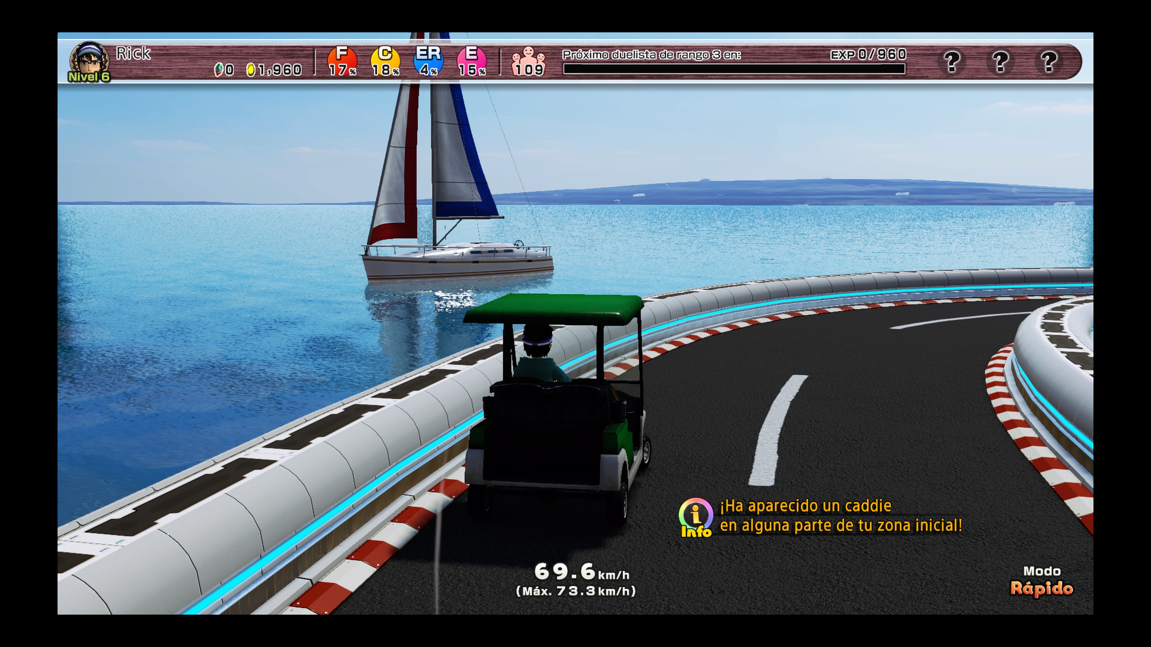 Pero no adelantemos las cosas ya que nosotros empezaremos desde abajo, desde el nivel principiante. Como ya hemos indicado con anterioridad a medida que disputemos los campeonatos iremos ganando puntos de experiencia, una vez que rellenemos el nivel en el que nos encontremos aparecerá un retador que nos propondrá que nos batamos con él en un torneo con reglas distintas a las competiciones ya que aquí cada uno de los jugadores tiraran por turno en lugar de todos a la vez. Si conseguimos derrotar a cada uno de estos tres rivales en una categoría aumentaremos de rango y seremos recompensados subiendo de nivel y con nuevos objetivos, entre los que se incluyen ropa, nuevas bolas o palos de golf. Incluso, algo vas avanzado en el juego, podremos llegar a desbloquear hasta un carrito de golf, una forma mucho más rápida y divertida de moverse tanto en la Golf Island como en el campo de juego.