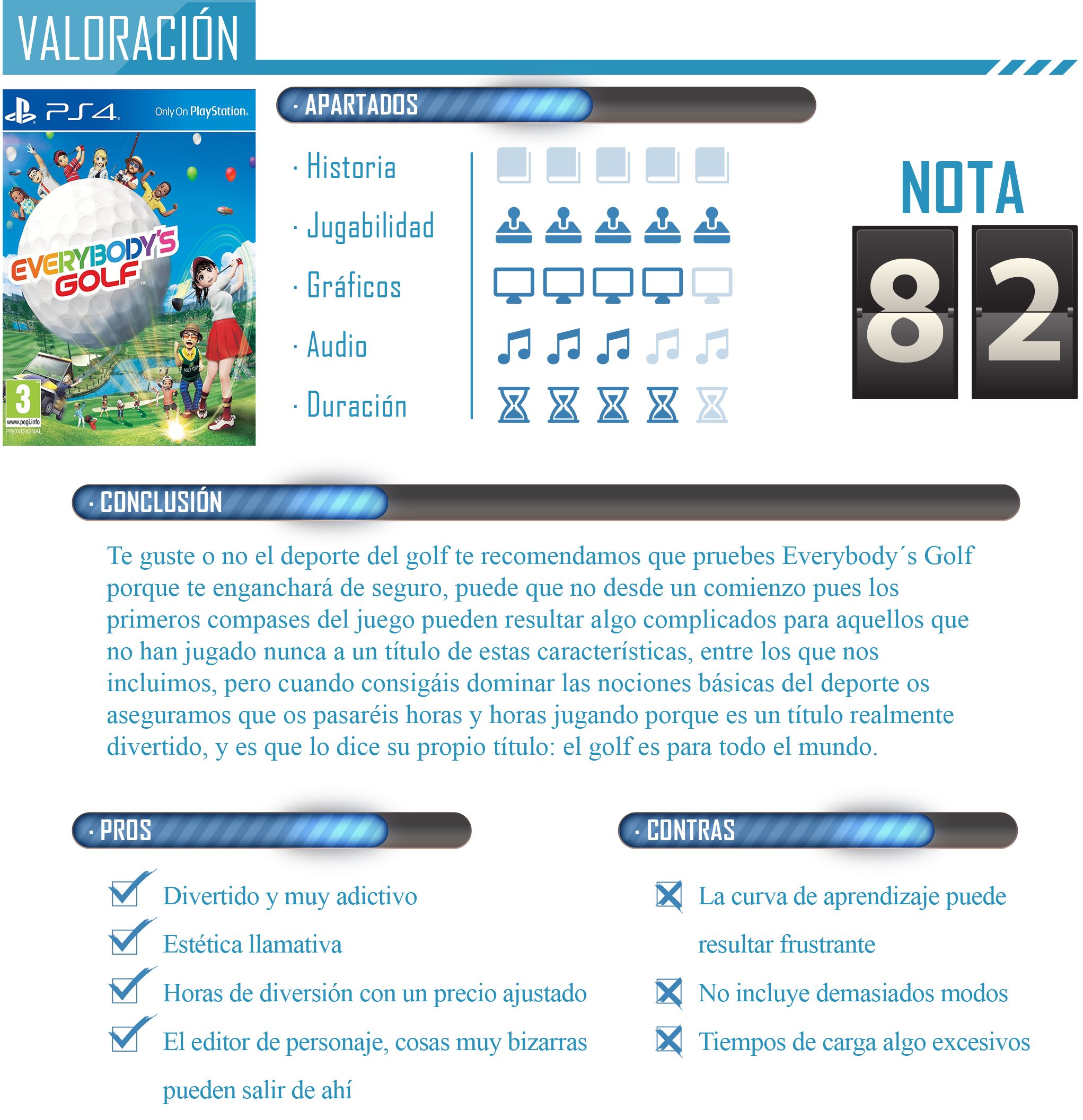 Esta nueva entrega de Everybody´s Golf sirve para conmemorar el 20 aniversario de la saga, surgida en 1997. Con dos décadas a sus espaldas, el título de Clap Hanz no reinventa el género pero si sienta las bases con unas nuevas mecánicas y opciones jugables de un título que sin duda hará justicia a una franquicia tan longeva como esta, haciendo que los jugadores veteranos se reenganchen y consiguiendo captar nuevos adeptos que se unan a los millones de jugadores que están repartidos por todo el mundo y eso es porque el golf es para todos.