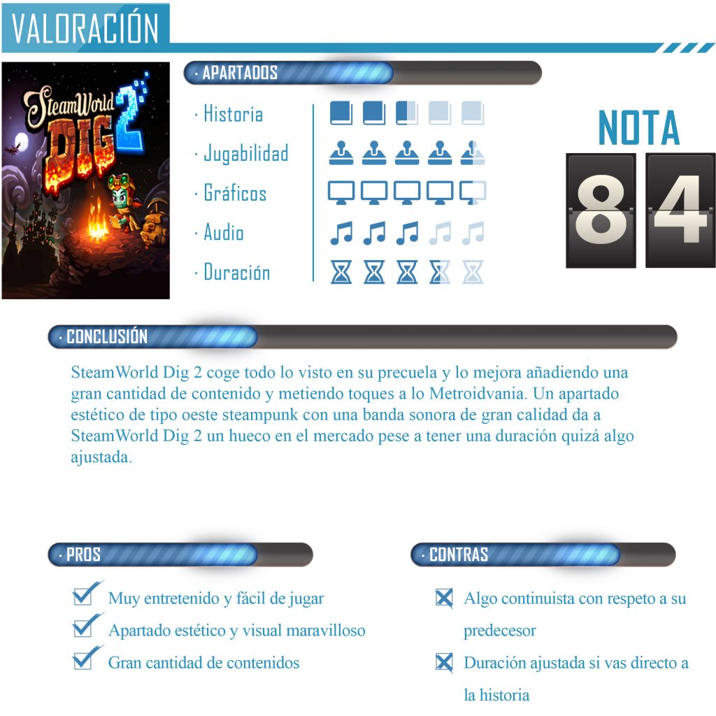 SteamWorld Dig 2 goza de un alto componente de exploración, no solo se trata de ir cavando hacia los lados para conseguir materiales, sino que durante nuestra aventura encontramos unas cuevas que nos supondrán pequeños retos de plataformas o resolución de escenarios que nos premiarán con engranajes. Sumar a todo esto los secretos que abundan en el juego y que nos darán una serie de coleccionables y tendremos una aventura adictiva que nos propondrá unas muy buenas siete u ocho horas de diversión, con grandes dosis de plataformas, aventura, acción y exploración.