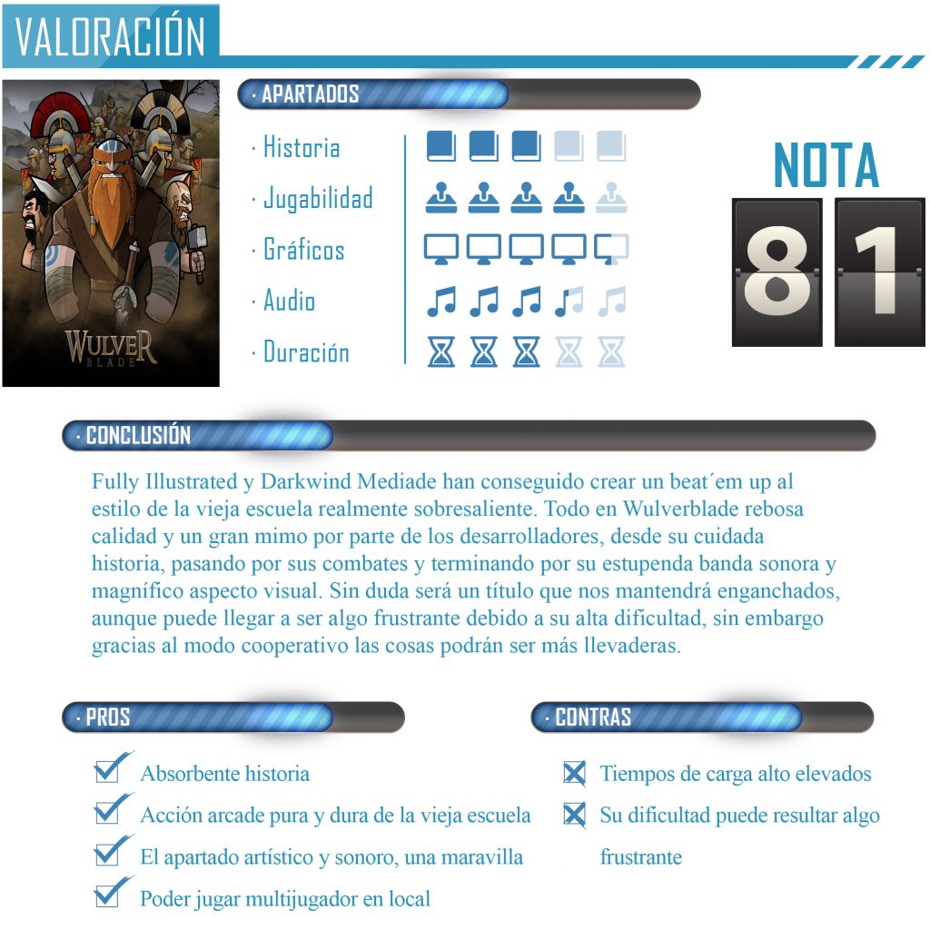 Completar Wulverblade es todo una hazaña, no os vamos a engañar, es un juego difícil, muy difícil, tanto en su modo normal como en el arcade, un reto al que solo se enfrentarán los más atrevidos y en el estaremos enganchados durante horas hasta poder completarlo, eso si somos capaces. Completar el modo Campaña pude llevarnos entre 5 o 6 horas, vale que puede parecer poco, eso es si somos realmente habilidosos, sino este tiempo se puede disparar hasta límites insospechados. A esto hay que añadir también que a lo largo del juego encontraremos diversos objetos coleccionables como armas o notas históricas que podremos consultar posteriormente desde el modo extra.
