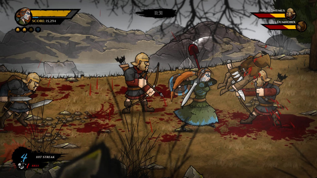 En cuanto al sistema de combates veremos como contaremos con nuestra arma principal, una espada, y una serie de armas de carácter arrojadizas que iremos recogiendo en los diferentes niveles que encontremos y que serán realmente útiles contra algunos enemigos, pero en Wulverblade esto va un paso más allá y podremos arrojar incluso miembros apuntados de nuestros enemigos. Además de esto también podremos defendernos gracias a un escudo que portaremos que nos supondrá una medida efectiva contra los ataques de nuestros enemigos, ya sean espadas o flechas. Con las armas podremos atacar y hacer combos pero también tendremos la posibilidad de realizar un ataque especial de rango que ocasionará daño a los enemigos que nos rodean, pero hay que tener cuidado como usamos esto ya que nos restará vida.