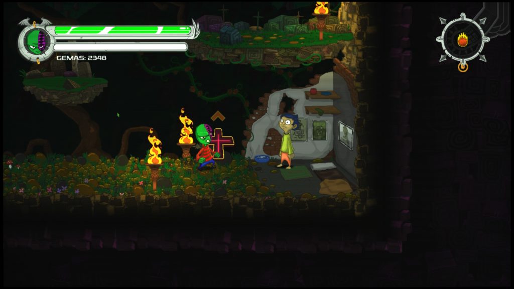 Al mencionar ya a los bosses finales nos damos cuenta que el desarrollo que va a tomar el juego va a ser bastante clásico y es que en ese sentido no innova pero si es cierto que presenta unas mecánicas entretenidas y desafiantes. Nuestra aventura se basará en pasar pantalla tras pantalla y en derrotar a todos aquellos enemigos que se pongan a nuestro paso, estos al morir nos soltaran una serie de cristales de diferentes colores y valores que podremos recolectar para utilizarlos para acciones como guardar la partida pues en Nightmare Boy esta acción no será gratuita y cada vez que queramos salvar nuestro proceso veremos como la cuantía de cristales necesario para ello aumenta por lo que tenemos que andar con sumo cuidado. Hay un detalle que nos ha sorprendido y es que la misma Parca es la encargada de salvar nuestro proceso.