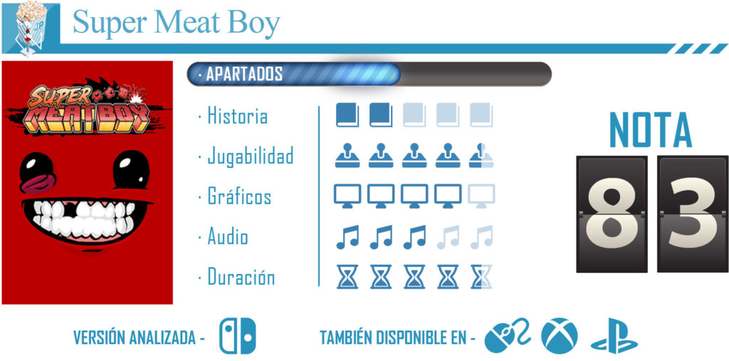 Estamos ante un título de calidad a un precio más que razonable. Super Meat Boy viene ni que pintado a la consola de Nintendo y permite usar tanto su portabilidad, para poder echar unas partidas en ratos muertos, como la función de los Joy-Con para poder jugar para dos jugadores. Sin duda es un título imprescindible para aquellos que les gustan los desafíos y «sufrir» con los videojuegos difíciles y exigentes.