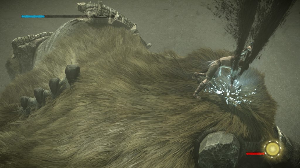 Localizar al coloso será solo el primer paso, pero cuando los encontremos nos daremos cuenta de que la cosa se pone seria. Estos seres majestuosos y descomunales son de un tamaño muy superior al de nuestro protagonista, por ello deberemos tirar de nuestro ingenio para hacerles caer, pero ¿cómo hacemos esto? Aquí entra en juego el factor de la observación, como podemos ver estos colosos, en esencia, tienen un cuerpo construido a base de elementos orgánicos como puede ser la piedra, tierra o hierba, pues bien, este último elemento rodeará el cuerpo de cada uno de los colosos en alguna de las zonas de su cuerpo como si fuera pelo y deberemos usarlo para agarrarnos a él y poder escalarlo como si fuera una montaña. Y aquí ya entra en juego la segunda acción que deberemos emprender contra ellos que será derrotarlos, para ello debemos localizar su punto débil, marcado con un símbolo azul, que se encontrará en alguna zona de su cuerpo, así clavaremos nuestra espada en esa zona una y otra vez hasta restarle su barra de vida por completo y derrotar al coloso.