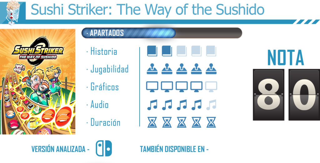 La banda sonora le da a Sushi Striker termina por engancharnos y absorbernos en el juego. La música frenética y rítmica invita a jugar y a pasar un buen rato. Y aquí queremos destacar la canción de la intro que, nuevamente señalar como si fuera un anime, nos presenta la historia que se irá desarrollando en el juego con los personajes principales, además he de admitir que esta canción la he puesto más de una vez en bucle porque tiene algo que me ha terminado atrapando.