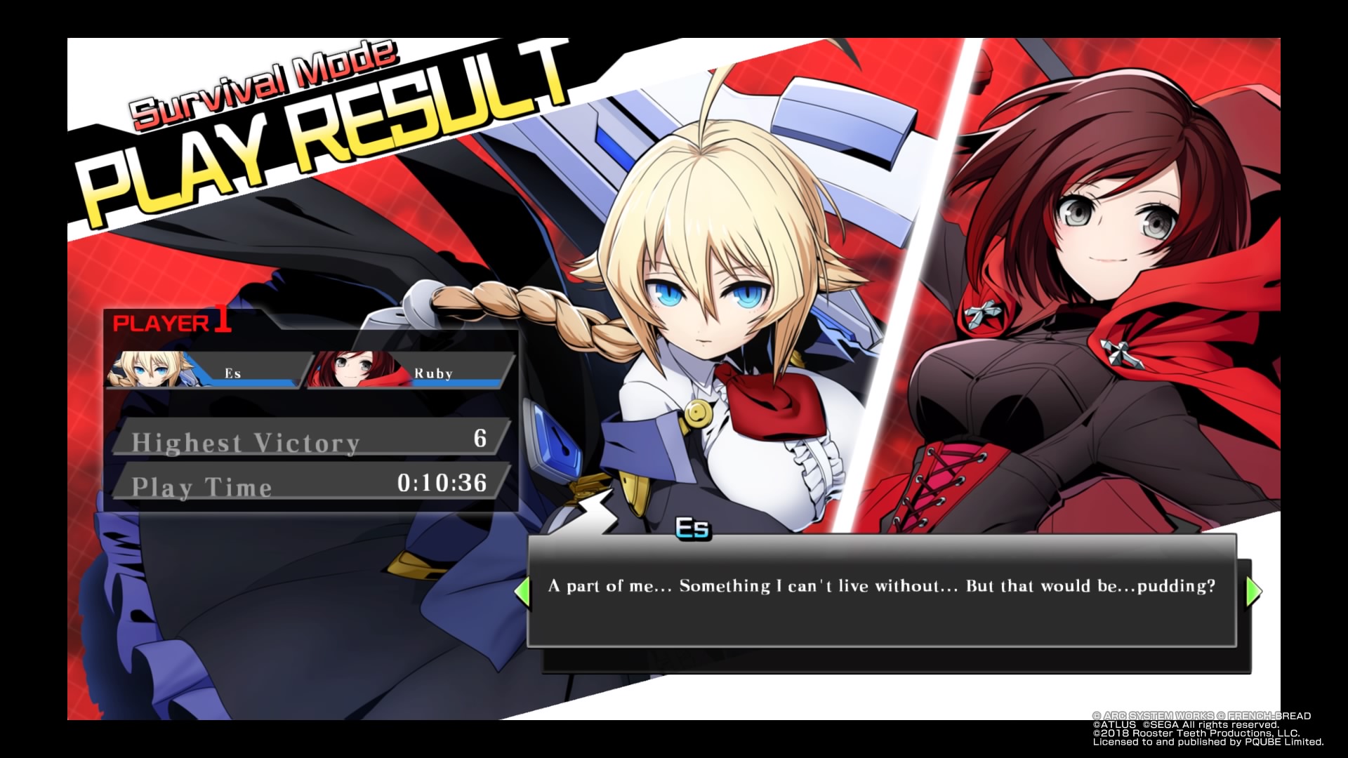 Por último señalar que no hay escenas de vídeo, los y las diferentes personajes aparecen con una pose determinada, y para varias sus expresiones de forma visual utilizan iconos como gotitas de sudor, el símbolo del enfado, etc. Para el movimiento simplemente juntan las figuras, y en caso de que muchos personajes estén hablando a la vez, aparecen rectángulos en la pantalla con la zona de los ojos de los mismos. En el modo Episodio, al llegar al final, aparece una imagen fija en la que se superponen los cuadros de diálogo. En estos mismos cuadros de diálogo, aparece el nombre del personaje que está hablando en ese momento con una franja de color que dependerá de la saga a la que pertenece (Azul = BlazBlue, amarillo = Persona, morado = Under Night In-Birth y rojo = RWBY), lo que facilita a los jugadores/as que no conozcan todos los juegos a asociar personajes y seguir historias mejor.
