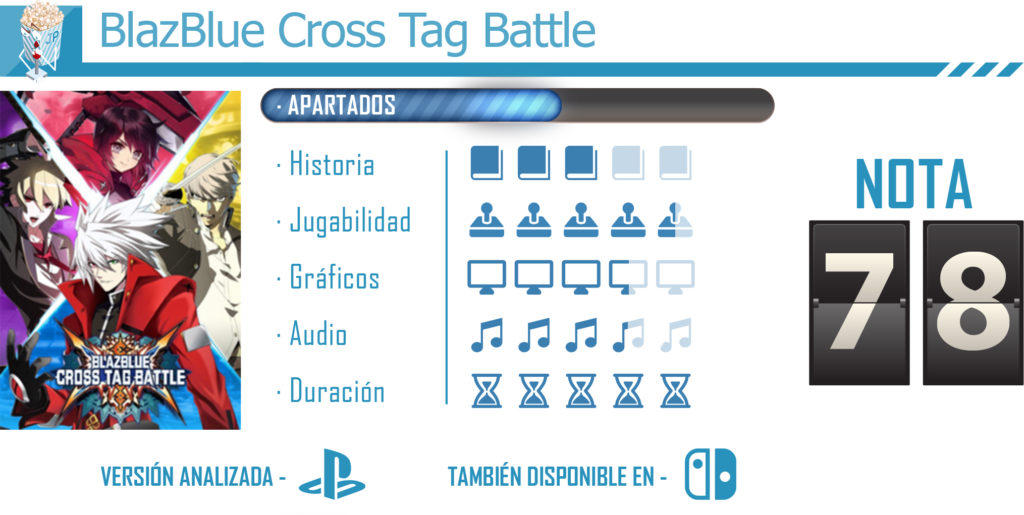 Nos encontramos ante un juego que nos ofrece bastantes posibilidades a la hora de jugar, ya que podemos hacerlo en solitario o en multijugador local u online y en los distintos modos de juego. Aunque el modo Episodio no tiene mucha rejugabilidad, es bastante entretenido, y además el fuerte de este juego son los combates, y por supuesto, el crossover, que nos permite jugar con multitud de personajes. Las mecánicas son muy sencillas y fáciles de aprender, por lo que casi cualquiera puede jugar a BlazBlue Cross Tag Battle sin frustarse demasiado. Un buen juego para echar la tarde solos/as o con amigos/as.