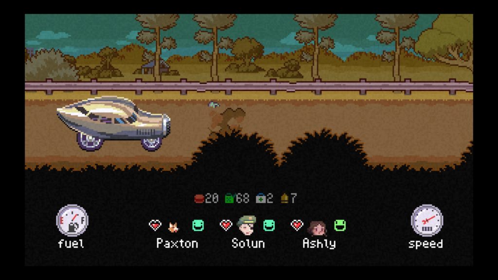 El coche es un elemento indispensable para completar nuestro viaje por lo que debemos cuidarlo y procurar tener combustible. A lo largo del juego tenemos diferentes vehículos con mayor velocidad, más resistentes, etc. Si perdemos nuestro vehículo podremos conseguir varios a lo largo de la partida.
