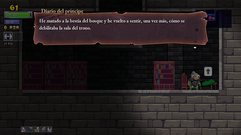 Su historia está en muy segundo plano y es fácil pasarla por alto, pues va siendo contada a través de una serie de diarios que vamos encontrando a lo largo de las distintas partidas, el final es bastante revelador e interesante, pero aun así nos encontramos con un apartado más bien anecdótico, pero que no deja de ser interesante y divertido de descubrir ya que lo que viene a contarnos Rogue Legacy es la historia de una familia que, generación tras generación, intenta acabar con el mal que asola la tierra y que se encuentra confinado en un castillo.