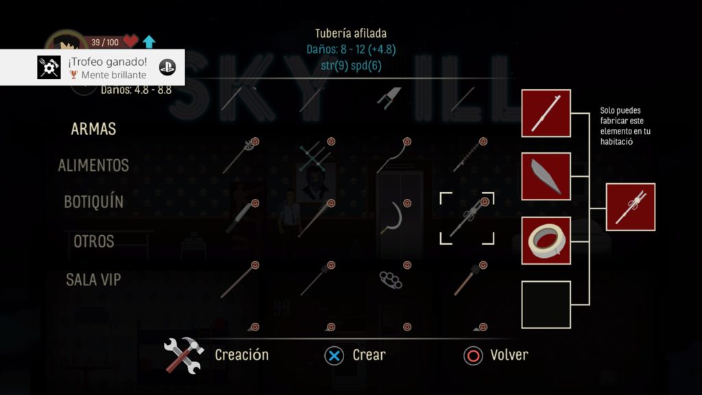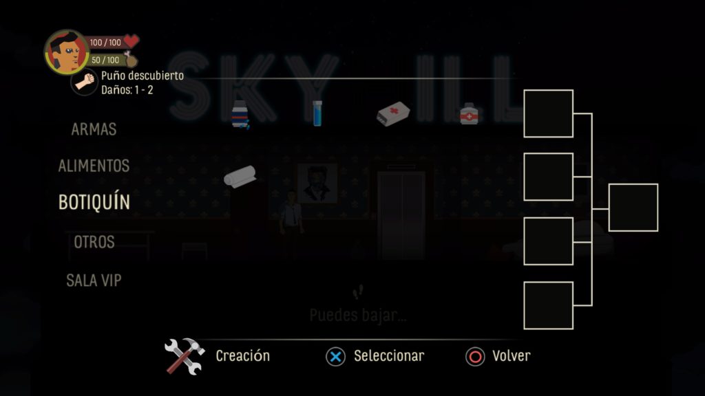 Nuestro objetivo es sencillo, salir del edificio bajando las 100 plantas de las que está formado el edificio., y durante la partida veremos los diferentes elementos de rol, roguelike y sobretodo supervivencia. En primer lugar tenemos nuestra suite con cuatro elementos fundamentales que son; la cocina que a medida que la mejoremos tendremos comidas más sofisticadas, luego está la mesa de trabajo en la que podemos craftear armas o elementos de construcción a partir de materias primas y botiquines, la cama donde podemos recuperar nuestra vida a cambio de gastar energía y por último la puerta que nos protegerá de que nadie entre mientras dormimos. Estos cuatro elementos podrán ser mejorados con diversos materiales que vayamos encontrando en las habitaciones.