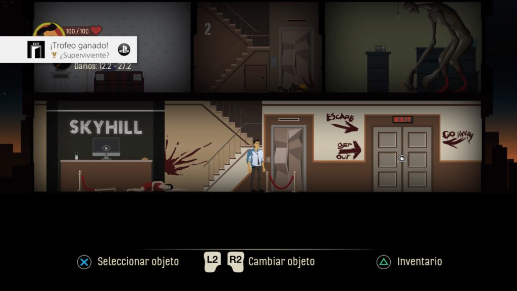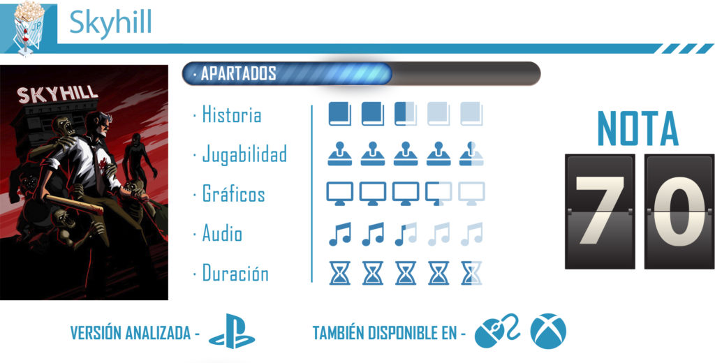 En cuanto a su duración estamos ante un terreno muy variable. Skyhill es un juego con mecánicas roguelike por lo que las partidas son distintas y cada partida completa puede llegar a dura una hora. La duración dependerá de lo que tarde el jugador en cansarse de esas mecánicas. La aleteroriedad de los escenarios, armas y enemigos, unidos a los distintos finales que ofrece, convierte al título en un juego bastante rejugable y perfecto para partidas más o menos rápidas.