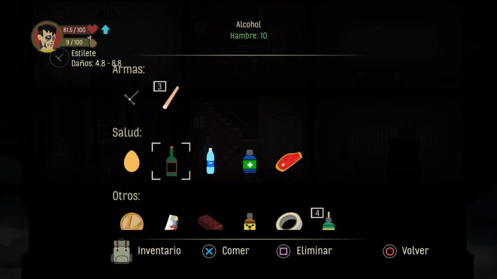 Pues bien comenzaremos a bajar, cada vez que nos movamos de habitación consumiremos un punto de energía o de comida, la barra amarrilla que tenemos debajo de la vitalidad. Es fácil recuperar esta barra pues solo tenemos que comer, cosa que es sencilla si tenemos alimento pero que nos condicionara si no la tenemos pues si la barra llega a cero cada movimiento nos costara salud. La salud se podrá recuperar o bien durmiendo en la cama, como hemos comentado, o con objetos de salud como botiquines o vendas.