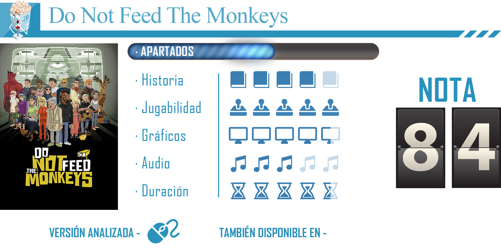 Hoy os traemos un análisis que, personalmente, esperaba con muchas ganas: Do Not Feed The Monkeys, desarrollado por Fictiorama Studio y editado por BadLand Games. Está disponible en Steam.