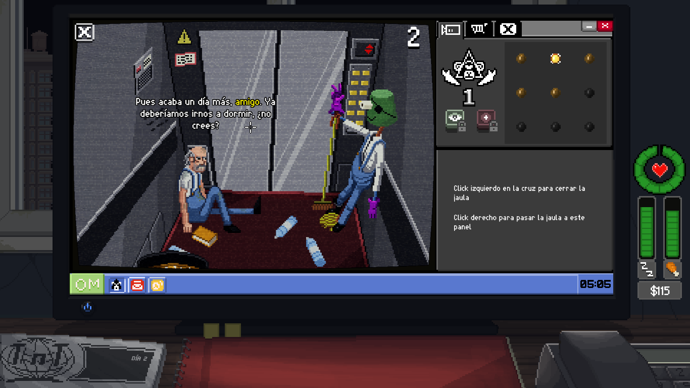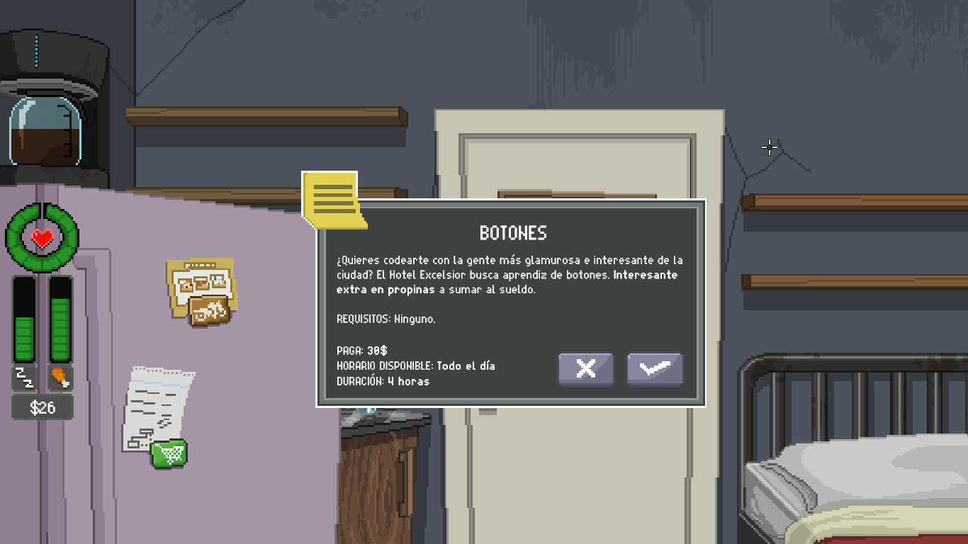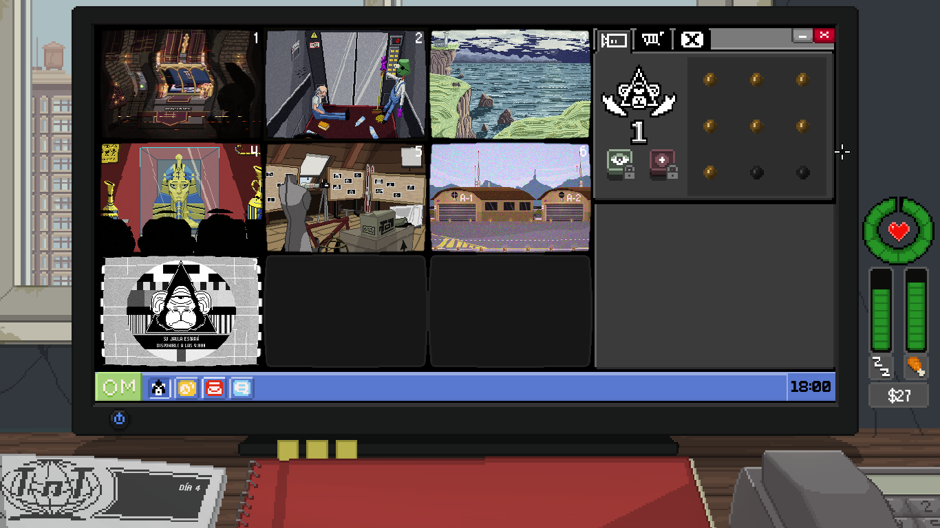Estos son los elementos principales del juego, que podremos jugar en dos modos: el que está por defecto y el modo Mirón, que es bastante más fácil, pero con el que no puedes desbloquear logros. El modo por defecto podrían haberle puesto un nombre como “realista destroyer” o “llora tras una hora jugando” porque al principio es MUY pero que MUY difícil balancear todo lo que tienes que hacer, pero es realista como la vida misma: tienes que ir hilando trabajo precario con lo de las cámaras (el Observatorio te suele dar unos 70 dólares y los trabajos van desde 12 hasta 100 dólares, si te pagan), comprar más para subir de nivel (50 cada cámara y 20 si quieres grabar o visión nocturna), pagar a la casera un alquiler altísimo por un cuchitril (90 dólares cada tres días, atraco) y comer regularmente. Misión imposible, no te da la vida, por eso el modo Mirón la facilidad ya que se mantiene mejor la salud, los indicadores no bajan tan rápido, aunque cuando ya estás familiarizado/a con las cámaras se hace un “paseo”. Cuando ya te conoces el horario de las cámaras, es más sencillo organizarse en el modo por defecto y terminar la partida.