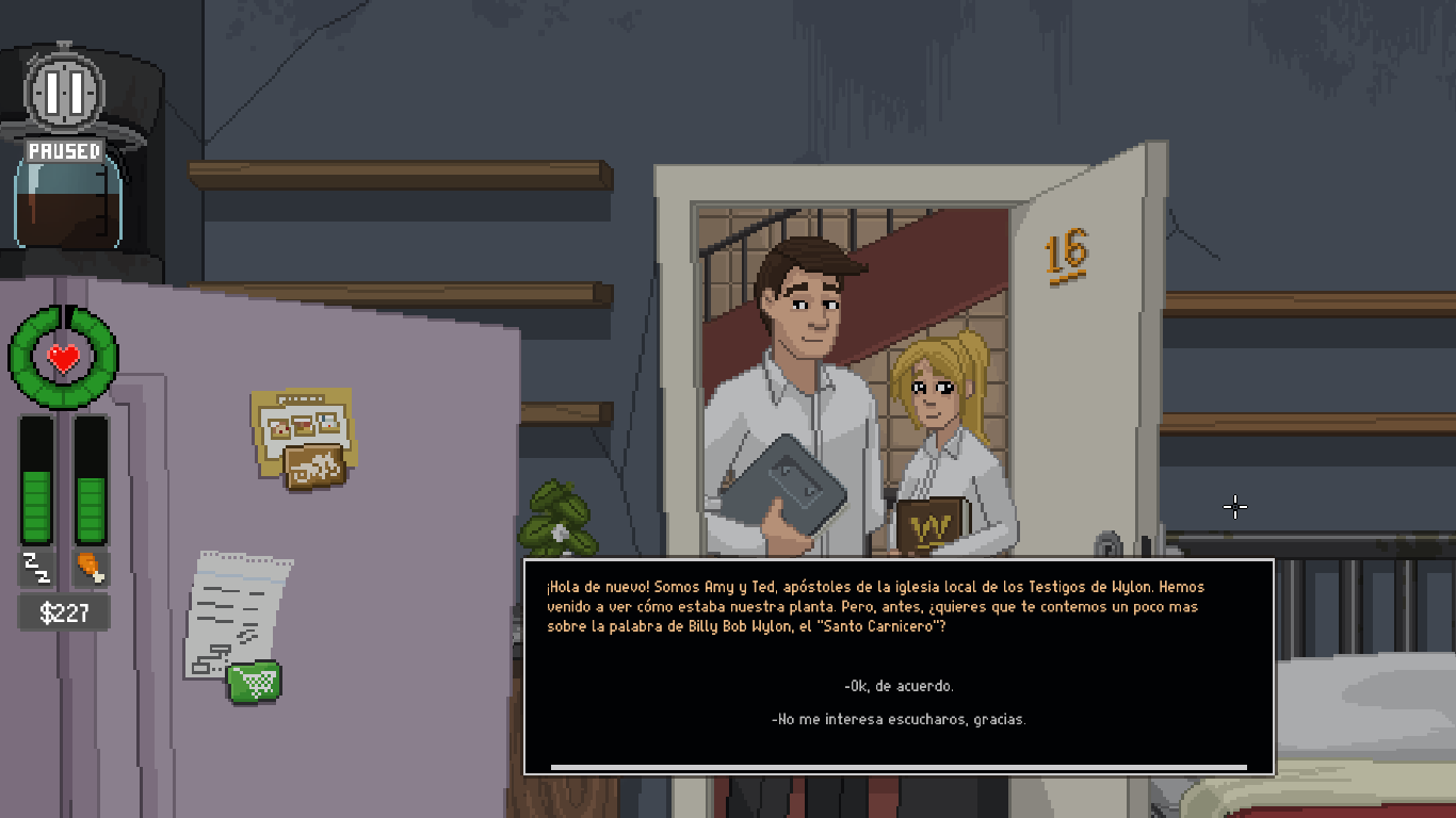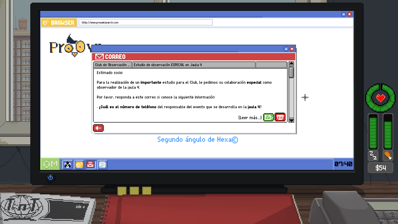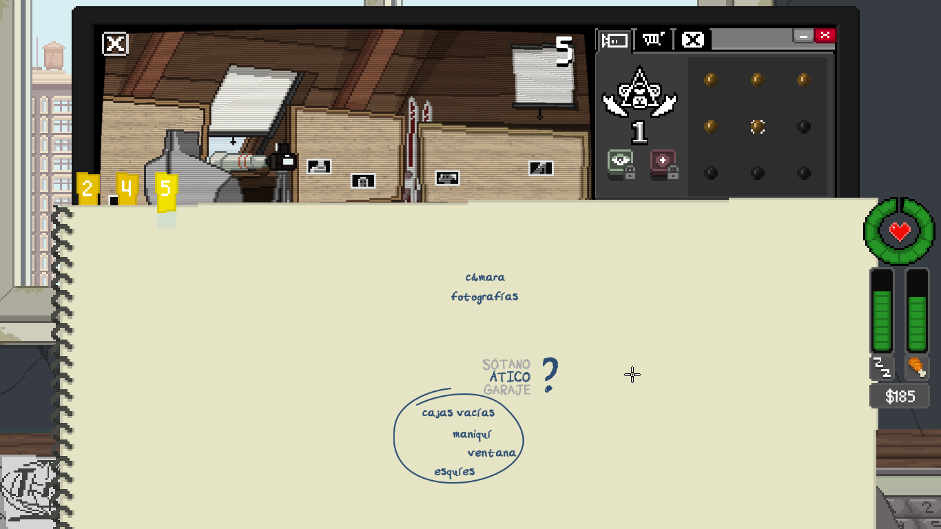 Estos son los elementos principales del juego, que podremos jugar en dos modos: el que está por defecto y el modo Mirón, que es bastante más fácil, pero con el que no puedes desbloquear logros. El modo por defecto podrían haberle puesto un nombre como “realista destroyer” o “llora tras una hora jugando” porque al principio es MUY pero que MUY difícil balancear todo lo que tienes que hacer, pero es realista como la vida misma: tienes que ir hilando trabajo precario con lo de las cámaras (el Observatorio te suele dar unos 70 dólares y los trabajos van desde 12 hasta 100 dólares, si te pagan), comprar más para subir de nivel (50 cada cámara y 20 si quieres grabar o visión nocturna), pagar a la casera un alquiler altísimo por un cuchitril (90 dólares cada tres días, atraco) y comer regularmente. Misión imposible, no te da la vida, por eso el modo Mirón la facilidad ya que se mantiene mejor la salud, los indicadores no bajan tan rápido, aunque cuando ya estás familiarizado/a con las cámaras se hace un “paseo”. Cuando ya te conoces el horario de las cámaras, es más sencillo organizarse en el modo por defecto y terminar la partida.