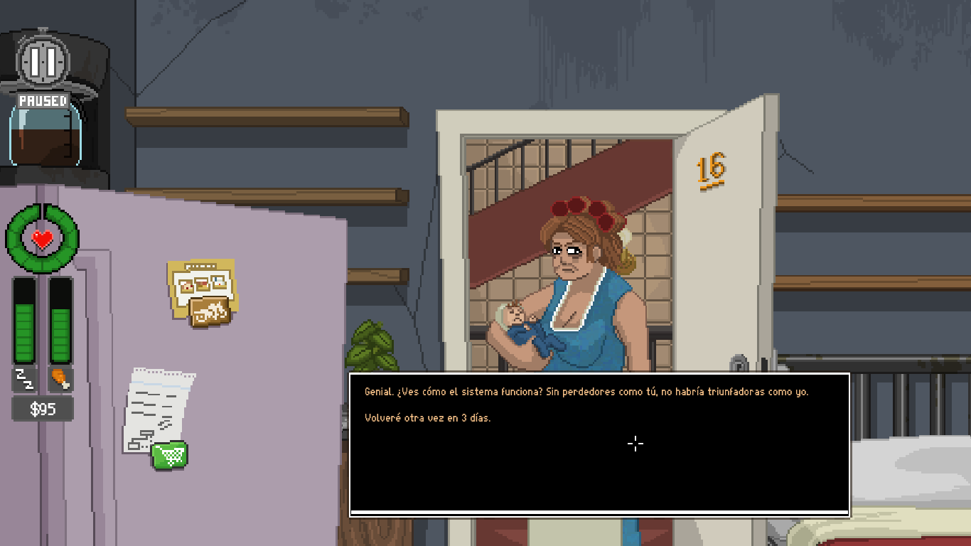 Alquiler. Cada dos días vendrá nuestra casera a pedirnos el dinero del alquiler, y da dos días si de margen para pagarla si no te encuentra en el piso, estás durmiendo o bien no tienes el dinero. Al tercer día te desahucian y se acaba la partida.