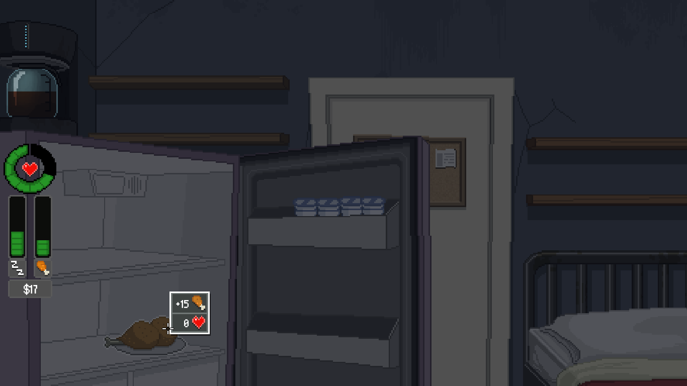 Mantenerte vivo. Para estar medianamente saludable tienes que dormir y comer, pero no cualquier cosa, ya que hay alimentos que aunque aumenten mucho la barra de la alimentación hacen que nuestra salud baje, como la comida basura, y muy pocos alimentos la suben, y además suben muy poco la barra. Si descuidamos nuestra salud, al trabajar podemos quedarnos sin sueldo, e interferirá en la vigilancia (al estar quedándote dormido se emborra la pantalla). Si el indicador baja a cero, se acaba la partida.