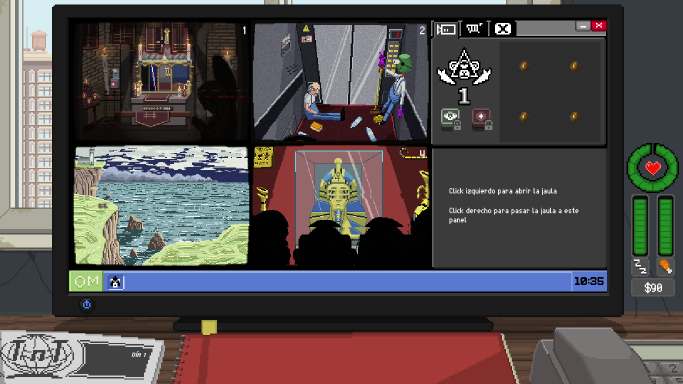 Cámaras. En las jaulas podremos ver objetos o por las conversaciones de los primates, iremos recogiendo en nuestro cuaderno palabras o conceptos claves para obtener información sobre los primates. Podemos completar la información con el buscador web. Cada jaula tendrá unos horarios en los que estén activas, y lo sabremos porque el panel brillará con una luz amarilla. Al comprar una jaula, no la tendremos disponible hasta las 9:00 del día siguiente, pero entra en el recuento de cámaras.