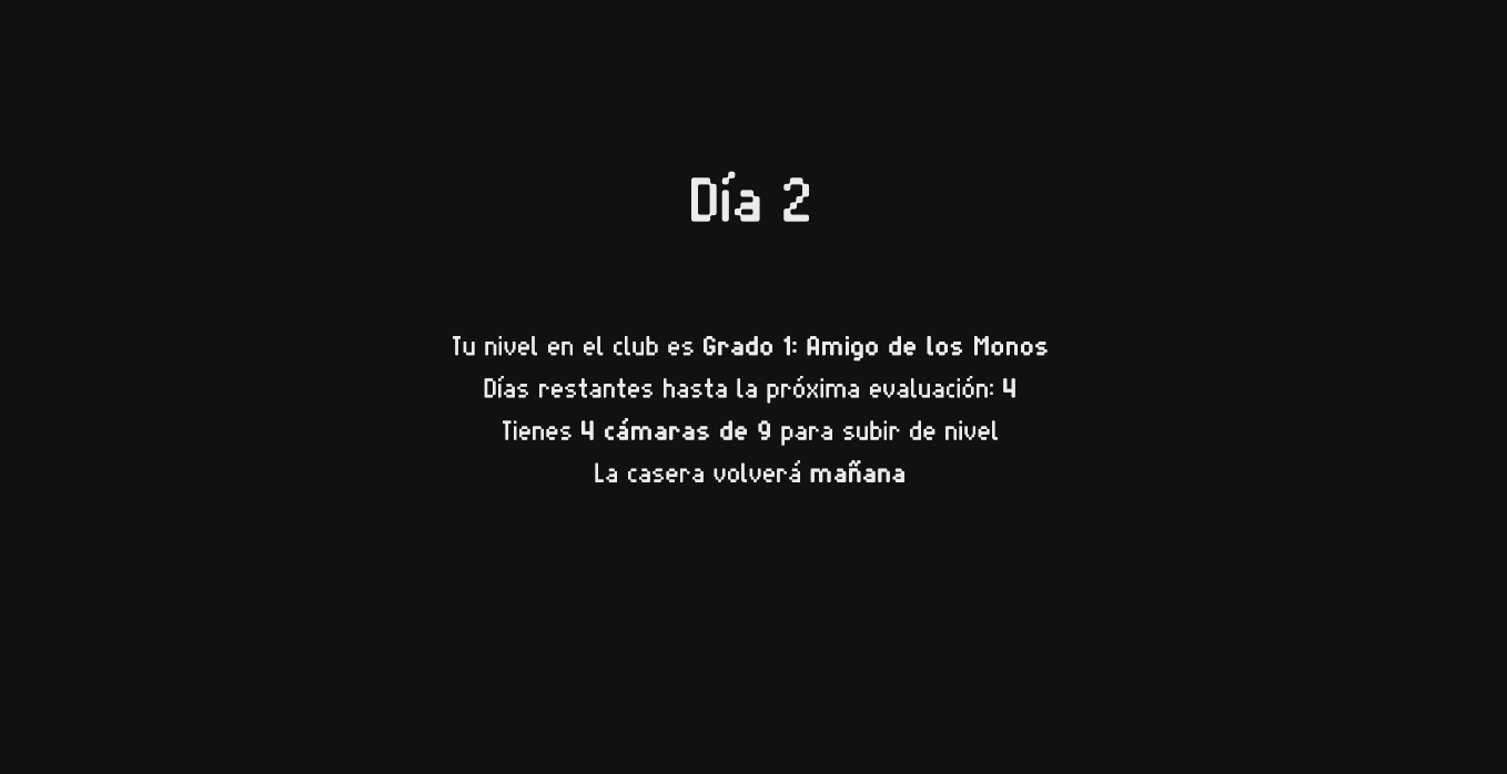 Nos acabamos de unir al Observatorio de Primates y tenemos una función: observar las jaulas de los primates y responder a la información que el Observatorio nos pida. Además, tendremos que ir subiendo de nivel, que se consigue con la compra de más cámaras (el número nos lo indican desde el propio Observatorio), y tenemos algo que está absolutamente prohibido: alimentar a los monos.