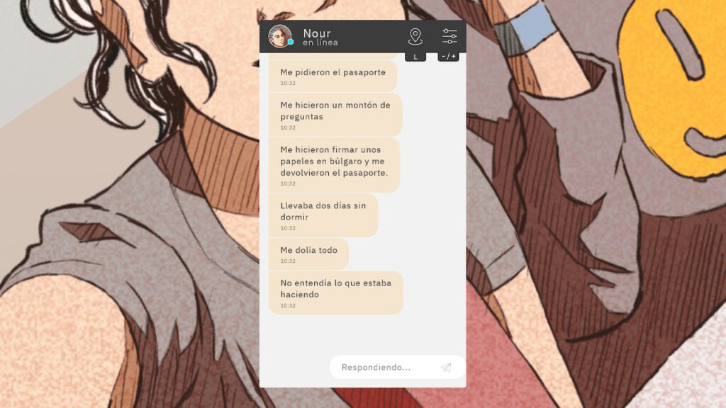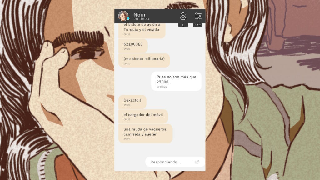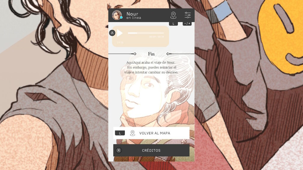 La interfaz es un chat genérico que se asemeja a cualquier app real. En cuanto a las fotografías, son dibujos de estilo occidental, que cuentan con bastantes detalles. Si jugamos con la Nintendo en posición horizontal, las imágenes que nos va mandando Nour se ponen de fondo de pantalla.