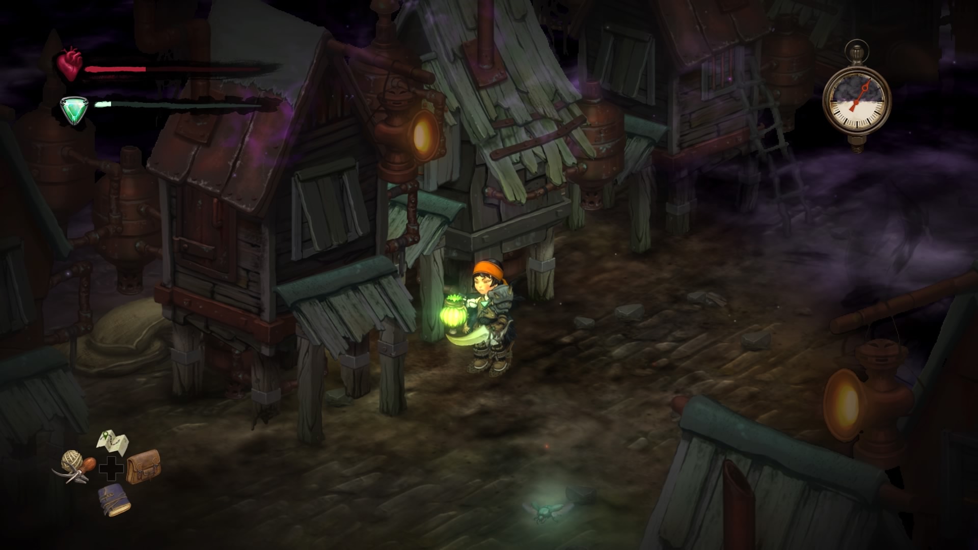 Por otro lado, tenemos el ciclo luz/humo. Por el día iremos normalmente, pero cuando llega el humo (que lo sabremos unos segundos antes por el reloj y por la alarma de cambio de turno de los drear), necesitaremos luz, la cual podremos obtener a través de las linternas o bien de nuestro colgante (hasta completar las primeras misiones sólo podremos con las linternas). Si no tenemos fuente de luz, el humo nos irá debilitando hasta morir. Además de las criaturas diurnas, en el humo encontraremos otras criaturas, como los fantasmas o los murciélagos, que son bastante fuertes, sobre todo los fantasmas, ya que tienen un grito que te roba la luz, y acaban contigo en un santiamén si no tienen una linterna o fuente de luz a mano. Siempre es preferible moverse de día, pero en ocasiones algunas misiones nos obligarán a ir a través del humo, por lo que tenemos que estar bien preparados. Las fuentes de luz que hemos mencionado son artilugios con un cristal que emana luz, insectos, terminales de guardado y objetos que portan algunos personajes.