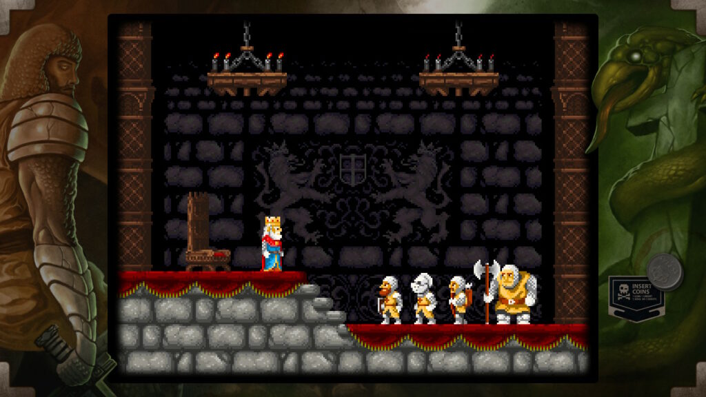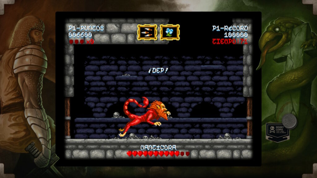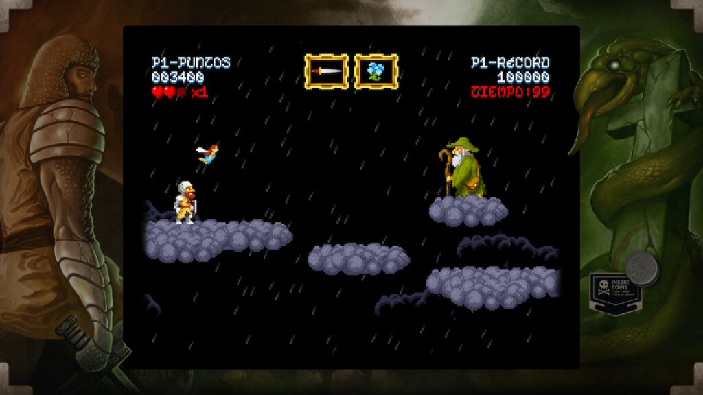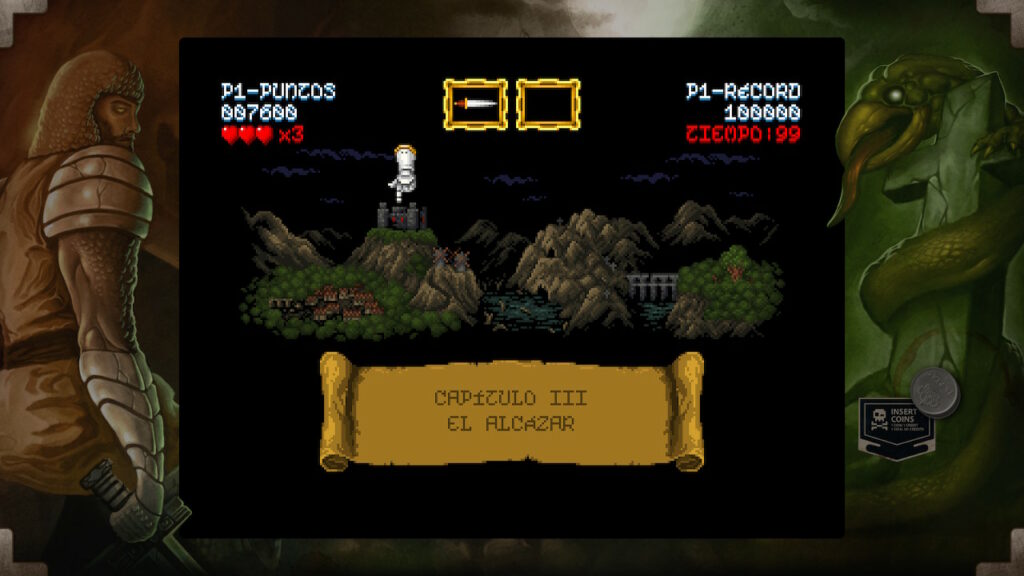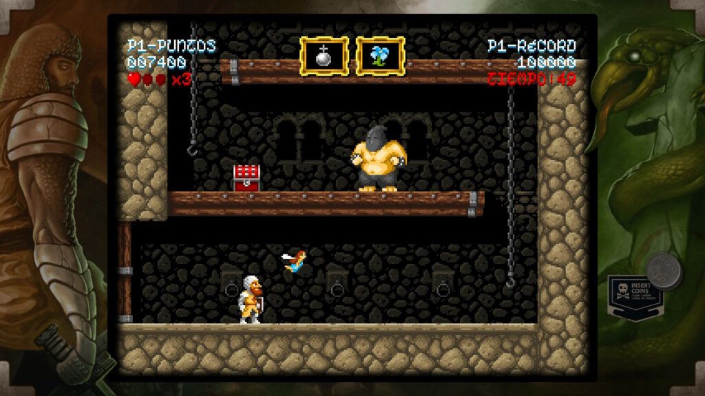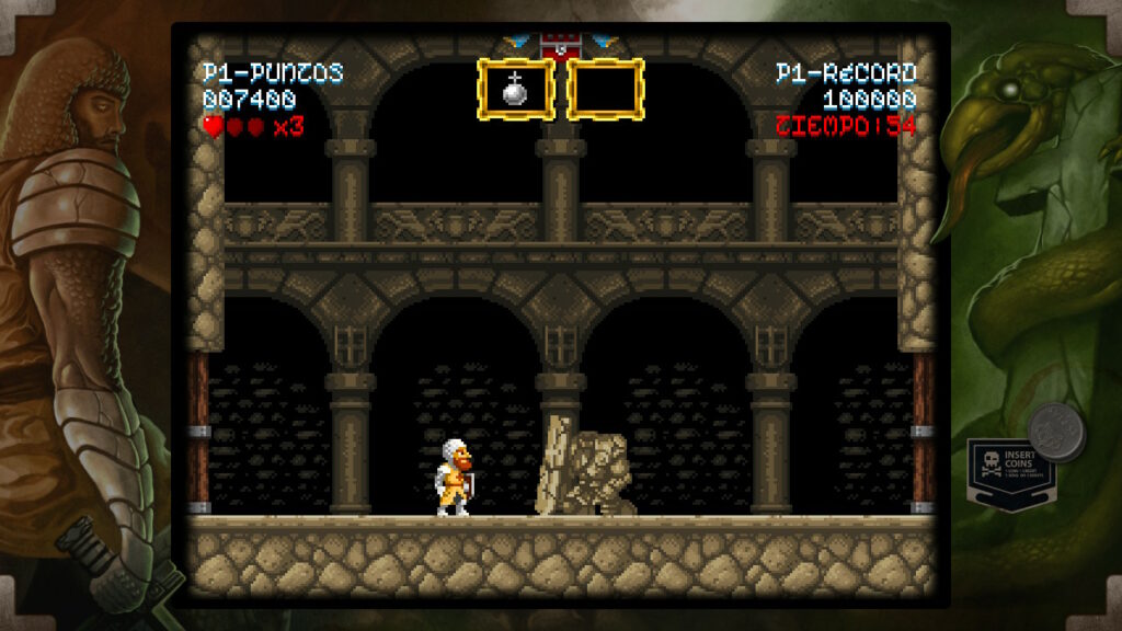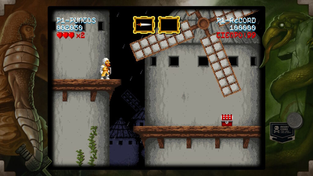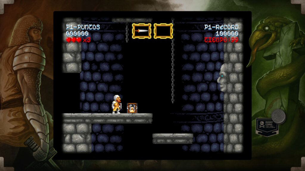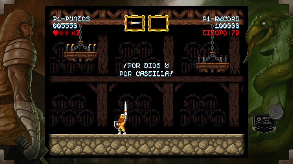 Tenemos controles de saltar y ataca que consiste en lanzar un determinado tipo de arma. Al principio empezaremos con el arma básica que son las espadas, pero lo largo del juego iremos encontrando una serie de cofres en los que podemos conseguir otro tipo de armas más o menos eficaz según la ocasión como pueden ser las dagas, hoces o hachas, entre otros. Pero estos cofres no nos proporcionarán únicamente armamento, también vitalidad, un elemento muy necesario para hacer frente a los peligros que se interpondrán entre don Ramiro y su meta pues, tal y como hemos indicado anteriormente, es un juego difícil y cualquier paso en falso puede ocasionar nuestra muerte y por lo tanto estos items de vida se convertirán en un recurso muy preciado.
