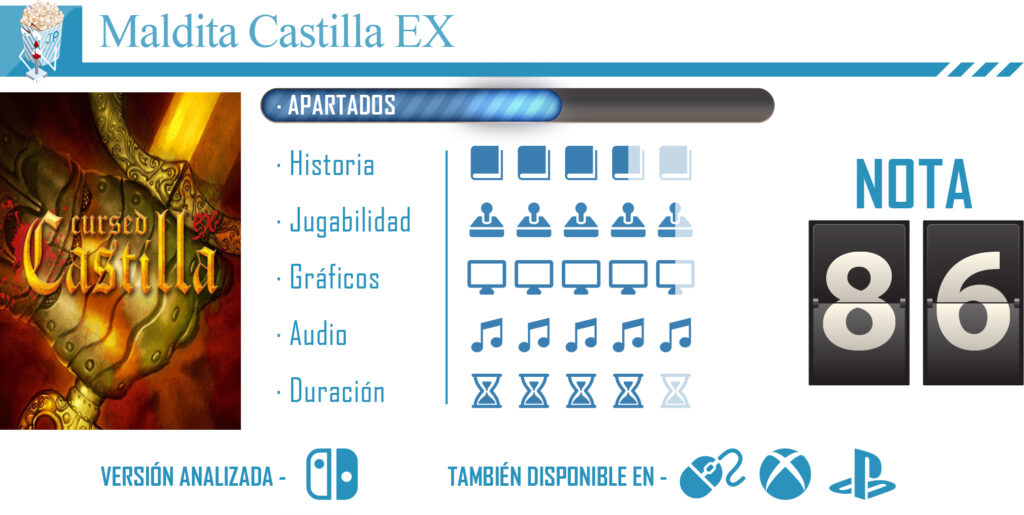 Si no habéis jugador a este clásico ahora tenéis una gran oportunidad, si ya lo habéis hecho es una buena ocasión para darle otra vuelta a este gran título. Maldita Castilla Ex en un gran exponente dentro de su género, con una jugabilidad muy adictiva y desafiante, pero no injusta ya que pone a prueba las habilidades del jugador y le proporciona una gran satisfacción cuando es capaz de superar los retos más exigente que le pone en su camino. La llegada de esta nueva versión para Nintendo Switch del título de Locomalito, Gryzor87 y Abylight Studios es sin duda una nueva oportunidad de disfrutar de las aventuras de don Ramiro, contando además con algunos añadidos y extras curiosos que sin lugar a duda gustará a los fans y seguidores de este particular caballero.