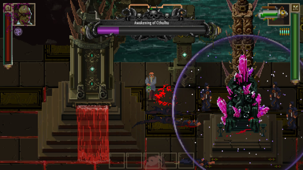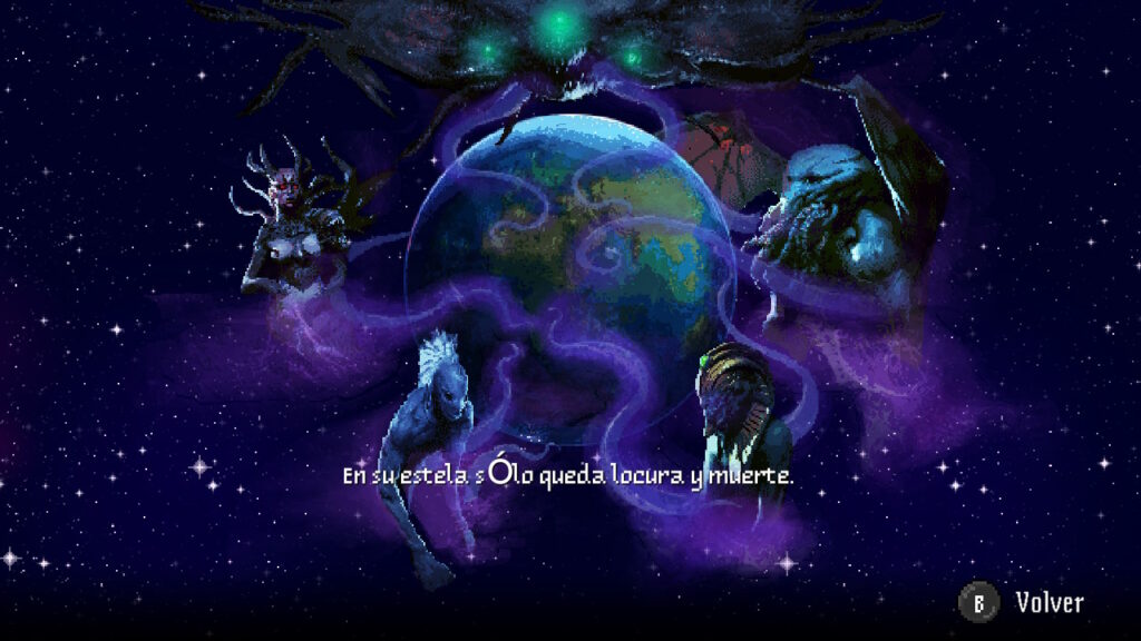 Lovecraft’s Untold Stories es un juego de corte pixel-art bastante detallado en algunos aspectos como son las animaciones de los antiguos o de las animaciones de game over. No es de los mejores que hemos visto, pero sí que están bastante bien hechas.