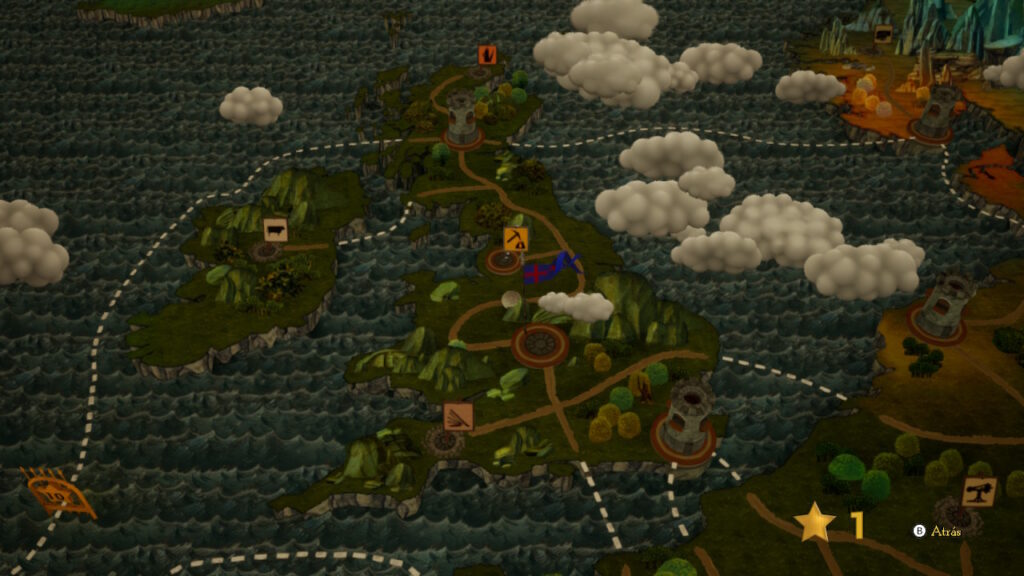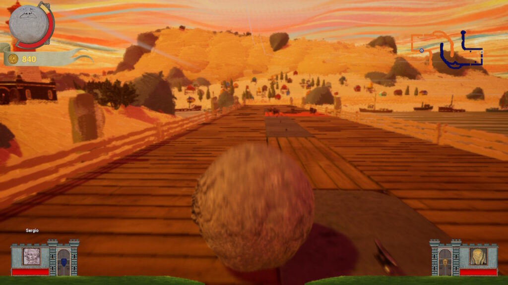 Después viene al hora de rodar. En esta segunda fase tomaremos el control de la bola y nuestro objetivo es recorrer el mapa y golpear la puerta de la fortaleza enemiga tan fuerte como podamos. Esto parece más fácil de lo que es pues la bola tiene un control terrible y no porque tenga un mal diseño, sino que está hecho así de manera deliberada con el fin de complicarnos el trayecto. Deberemos escoger que tipo de bola usaremos en la partida. Tenemos varios tipos y lo mejor es que cada una tiene unos atributos concretos como son mayor resistencia, fuerza, velocidad, y además también suponen una forma de jugar diferente y necesitaremos una u otra dependiendo del nivel en el que estamos. Existen rocas acorazadas, una roca cuadrada, una rueda, una bola de tela que flota pero que tiene poco peso, otra con un pequeño satélite, entre otras.