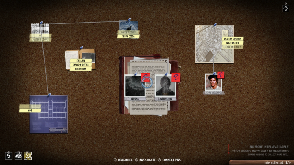 Algo propio del mundo de los espías son las interrogaciones y documentación. Según avancemos en la partida podemos hacernos con nuevos datos y documentos que se podrán consultar en la sala de análisis de documentos. Aquí podemos relacionar diferentes acontecimientos y documentos descubiertos en las misiones o sonsacados mediante interrogatorios. Todo ellos se montará como si fuera un propio rompecabezas, relacionando estos documentos e información entre si podemos obtener algunos resultados como nueva información sobre agentes rivales o sus tácticas empleadas.