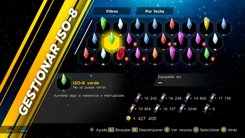 Otra manera de potenciar a nuestros héroes será mediante el uso de unos cristales llamados ISO-8. Hay un total de cinco clases de cristales que hacen referencias a los atributos físicos de los personajes, como fuerza, durabilidad, espíritu, vitalidad o espíritu. Cada uno de los personajes podrá equiparse un total de cuatro. Además será posible desintegrar algunos de ellos para conseguir nuevos recursos, o también será posible refinarlos con el fin de aumentar su poder.