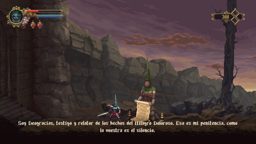 La misma historia de Blasphemous es también algo cierta mente llamativo, tanto por su temática como por la forma de narrarla. Aquí nos ponemos en la piel del Penitente, el único superviviente de la masacre de la Hermandad del Lamento Mudo. Tras despertar de tan terrible situación, este verá cómo se encuentra atrapado en un ciclo de muerte y resurrección debido a los pecados de la tierra, por ello su misión será purgar la maldición que ha recaído sobre las tierras de Orthodoxia y que responde al nombre del Milagro.