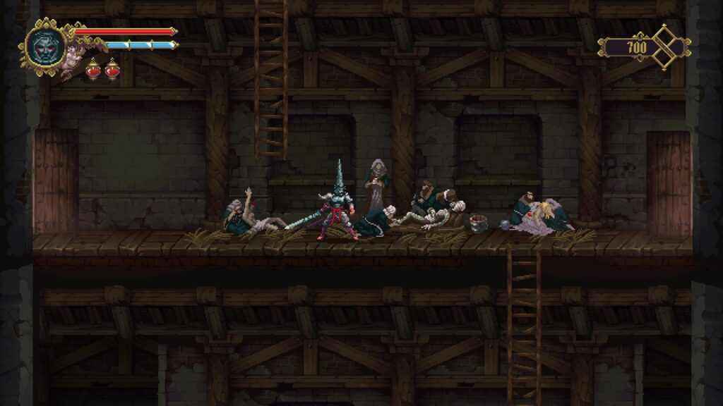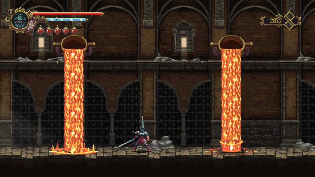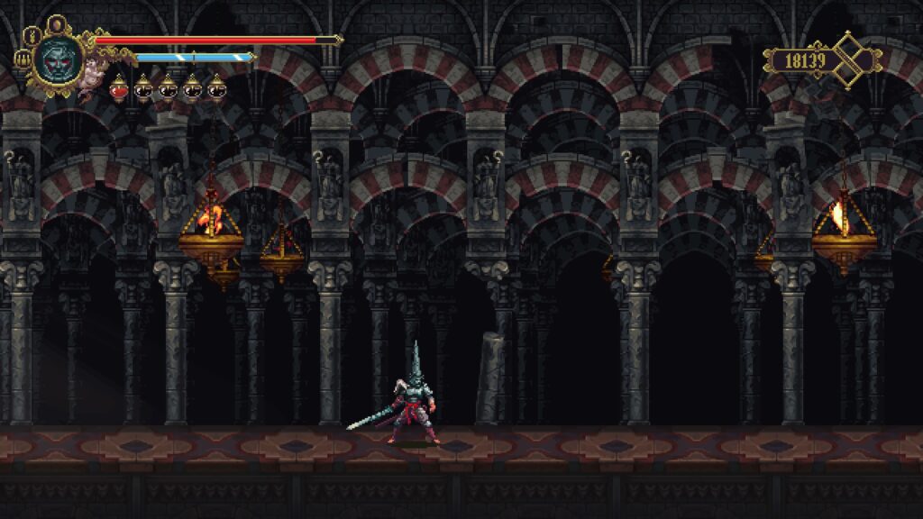 Aquí podemos hacer una división entre los escenarios y los enemigos. Por un lado tenemos esos lugares que visitaremos, de los cuales tenemos que alabar el buen trabajo de The Game Kitchen a la hora de representarlos. Desde aljibes árabes, catedrales góticas, claustros románicos o cárceles oscuras, habrá una gran variedad de entornos a explorar. Pero no pueden faltar la representación de algunos elementos artísticos clave en nuestro país, como puede ser la Mezquita de Córdoba, cuyos arcos aparecen fielmente representados en los últimos compases del título. Todos esos detallen dotan a Blasphemus de más vida y hará que nos vayamos fijando en cada uno de ellos mientras recorremos su entornos.