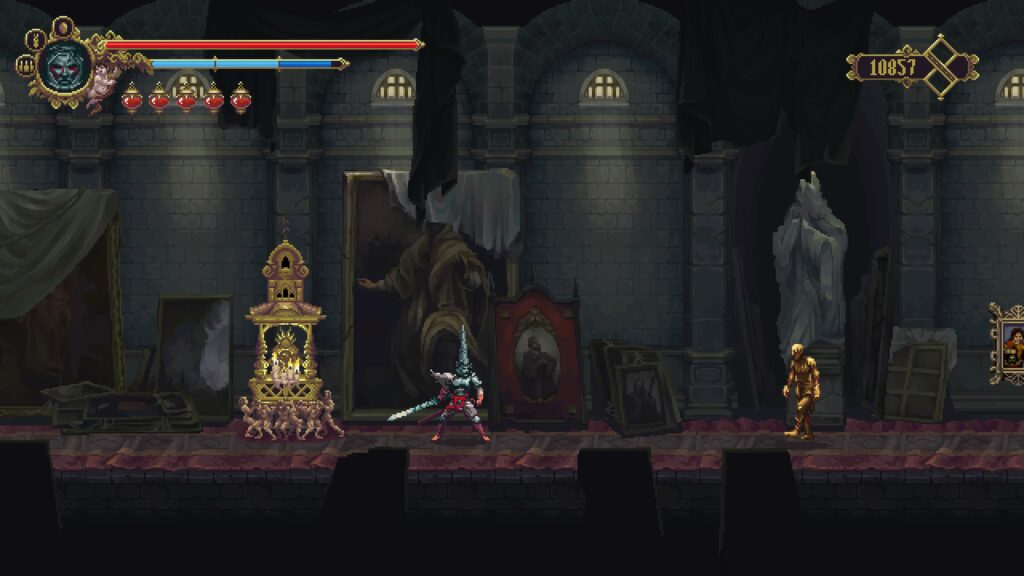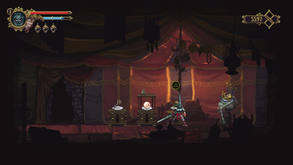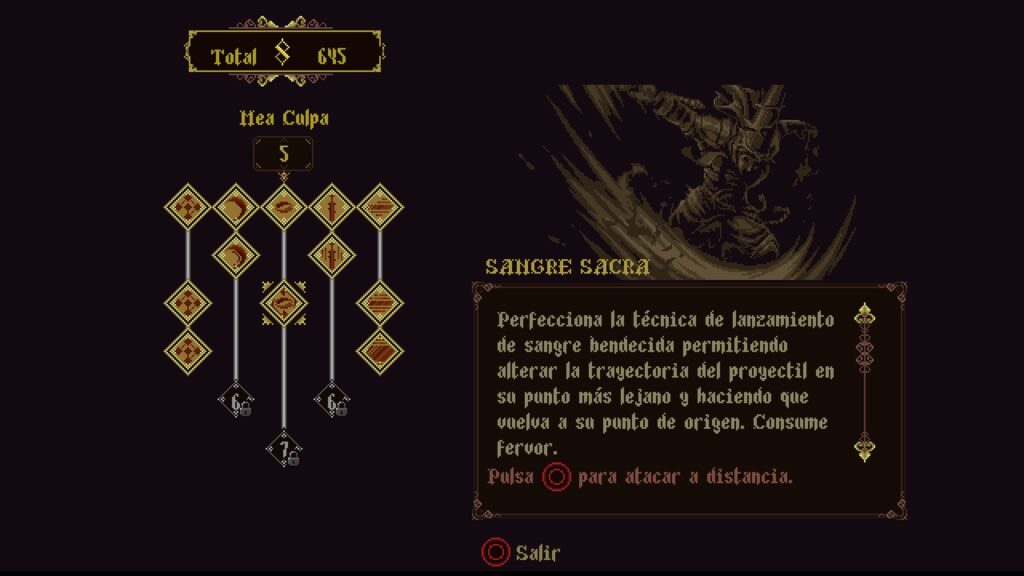 Ese poder se ve representado por Mea Culpa, la espada y única arma con la que contará el Penitente en su travesía. El posible que el hecho de contar con una única arma impacte de primeras, pero es lo suficientemente versátil como para no echar de menos otras. La Mea culpa tiene un sistema de progresión que hará que aumentemos su poder siempre que encontremos una serie de altares repartidos y escondidos por el mapeado. Allí el Penitente orará y su espada aumentará su poder, abriendo también un árbol de habilidades donde podemos desbloquear diferentes combos y nuevas formas de atacar.