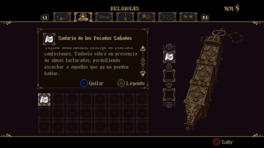 La Mea Culpa será el único arma con el contaremos en el juego, pero también tendremos a nuestra disposición una serie de artefactos con los que podemos mejorarla, como pueden ser las reliquias o el rosario. Estas reliquias se podrán enlazar directamente en la empuñadura de nuestra arma y nos dará algunas habilidades espaciales. Por su parte, las cuencas del rosario servirán para equiparnos determinados objetos que aumenten nuestras estadísticas o nos proporcionen algún bonus extra.