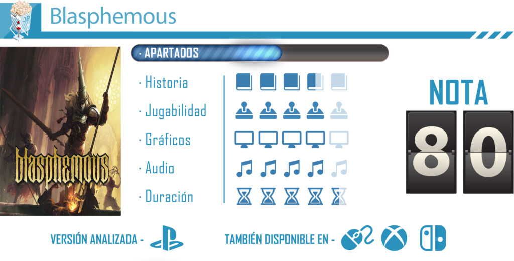 Con todo esto tendremos juego para rato. Blasphemus puede llegar a durar entre 15 a 20 horas, pero si queremos completar su mapa y desbloquear todos los secretos que esconde puede perfectamente aumentar en unas cinco o seis horitas más. Todas ellas llenas de diversión y elementos desafiantes que nos mantendrán enganchados mientras avanzamos por este oscuro mundo creado por el estudio sevillano.