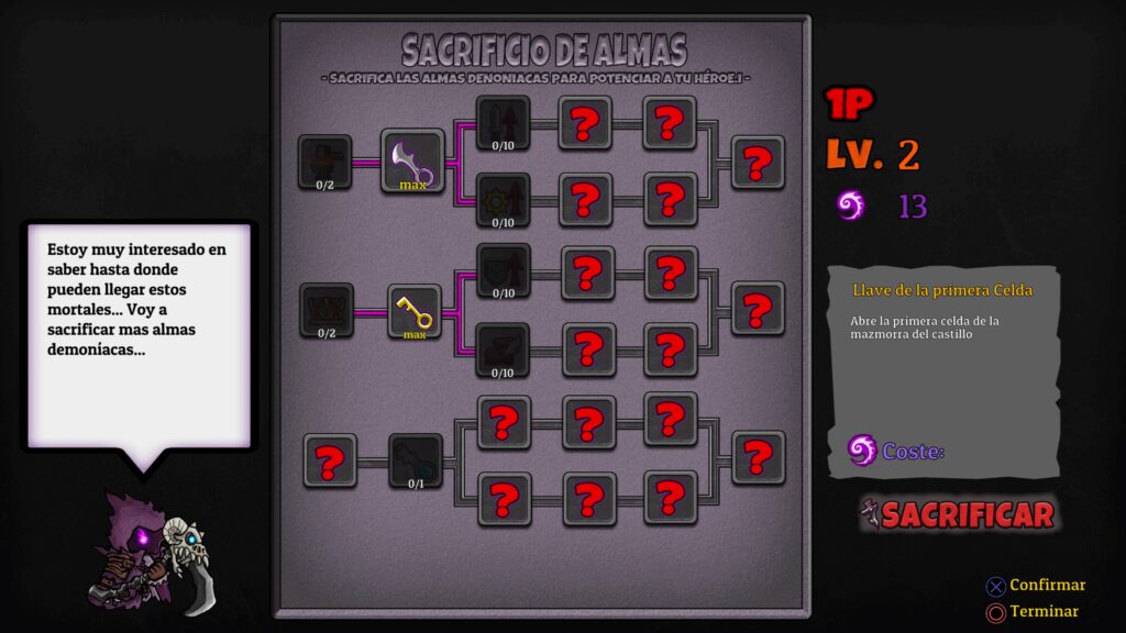 Lost Castle no es un juego fácil, no por lo menos durante las primeras partidas que juguemos ya que moriremos mucho, pero en esto también reside su esencia, en intentarlo una y otra vez. Cada vez que derrotemos a algunos enemigos nos premiaran con almas y estas podrán ser utilizadas una vez que muramos, en este momento se nos desplegará un árbol de habilidades donde podremos invertir estas almas para desbloquear nuevas habilidades, potenciadores o subir nuestros atributos. Esto nos ayudará en nuestras futuras partidas y hará que cada vez logremos adentrarnos más en las profundas oscuridades de las mazmorras.