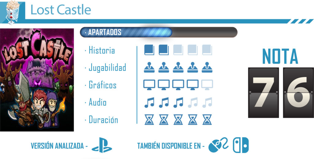Lost Castle es un título totalmente recomendable para aquellos que buscan disfrutar de partidas rápidas y desafiantes. Es un juego que sabe explotar sus recursos pero que funciona mejor si lo jugamos con otras personas que de manera individual. Los desafíos que presentan y el sistema de progresión hará que queramos echar una partida tras otra, consiguiendo así que nos enganchemos hasta que podamos completarlo.