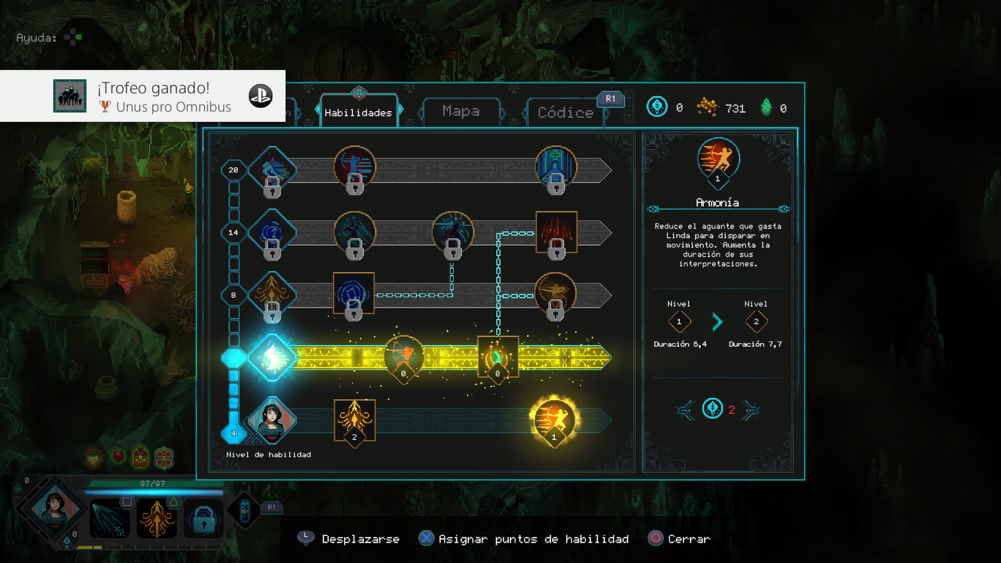 El sistema de combate es bastante simple, tenemos un ataque principal, siendo este el más sencillo, otro más fuerte pero consumirá nuestra estamina o poder, representado por una barra azul, y por ultimo tenemos un ataque especial que también consumirá cierta cantidad de energía. Estos ataques tendrán un tiempo de recarga que se verá reducido a medida que vayamos subiéndolos de nivel. El control es fácil e intuitivo, tenemos los botones de ataque y un botón para poder esquivar, poder usar objetos o tótems. Destacar que los personajes que atacan a distancia se manejan con los dos sticks, uno para moverse, común a todos los personajes y el otro para poder atacar, esto nos recuerda a The Binding of Isaac.