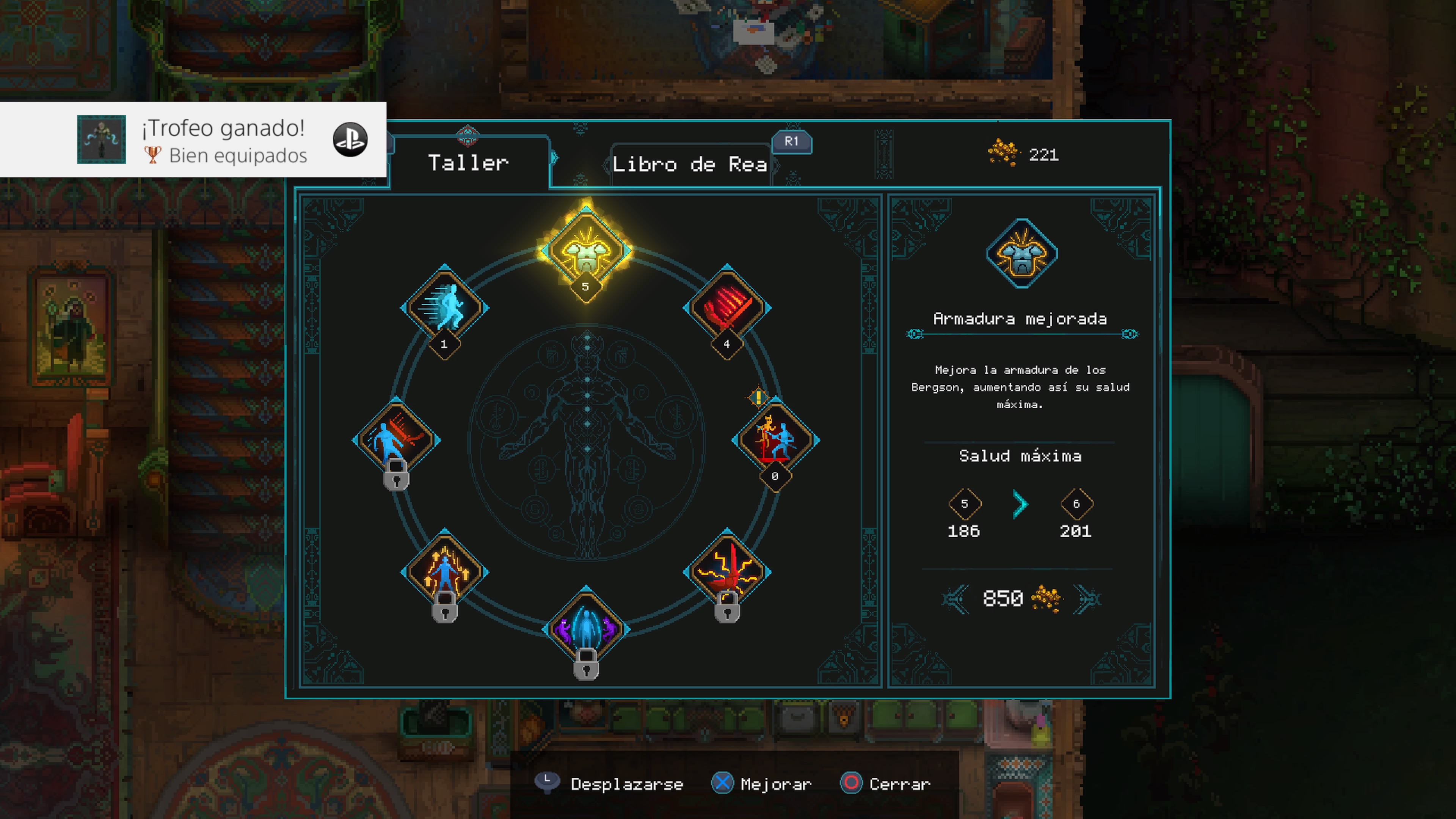 Hablando de los atributos, existe otra forma de potenciar a nuestros personajes. Tenemos nuestra propia moneda, el morv que iremos recolectando en cada nivel. Lo gastaremos en el taller del tío Ben para mejorar la salud, ataque, velocidad, críticos y otros, o también podemos gastarlos en la biblioteca de la abuela Margaret que nos dará ventajas como conseguir más experiencia o dinero.