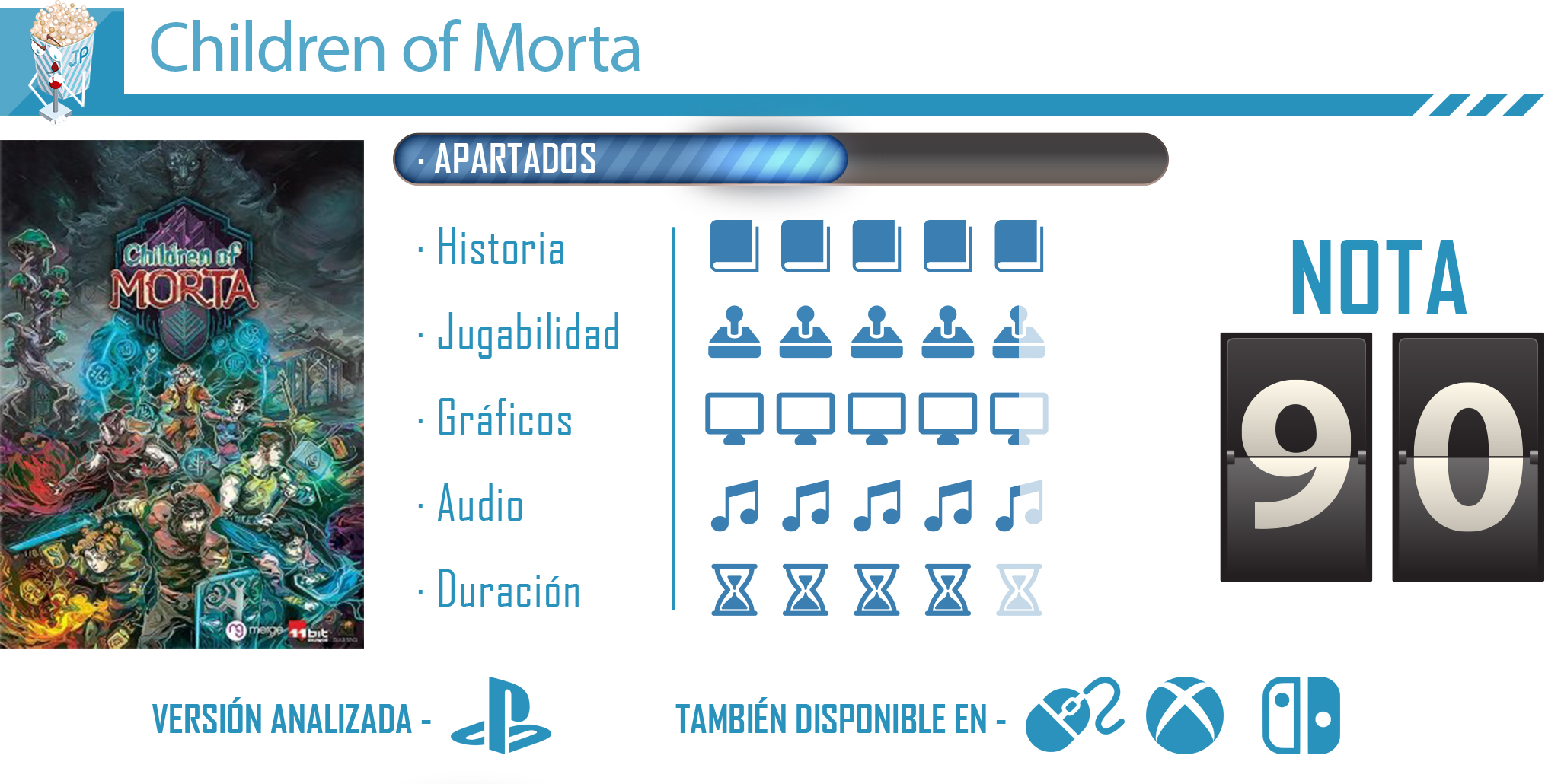 Children of Morta es un rogue-lite sobresaliente y con una jugabilidad muy entretenida. Tiene aspectos muy originales e incentiva a jugar y a permanecer enganchados hasta terminarlos gracias a su historia y narrativa, la posibilidad de completarlos en multijugador local o las diferentes formas de evolucionar a los personajes. Pese a sus maravillas no es un juego perfecto y presenta algunas limitaciones, como la repetición de ciertos eventos o la dependencia del farmeo para completar algunas zonas. Aún con esto, Children of Morta es algo único y totalmente recomendable para los aficionados a este género, su estética y mecánicas lo dotan de una personalidad totalmente diferente y con lo que sin duda disfrutaremos durante un gran número de horas.