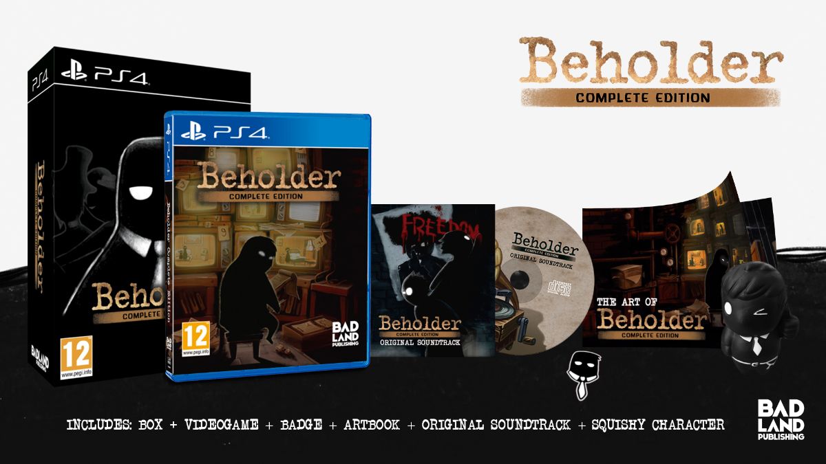 La edición coleccionista de Beholder: Complete Edition incluye el juego, su banda sonora, un libro con arte e ilustraciones, un pin y un muñeco «anti-stress» con el aspecto de Carl Stein, protagonista del título de Warm Lamp Games.