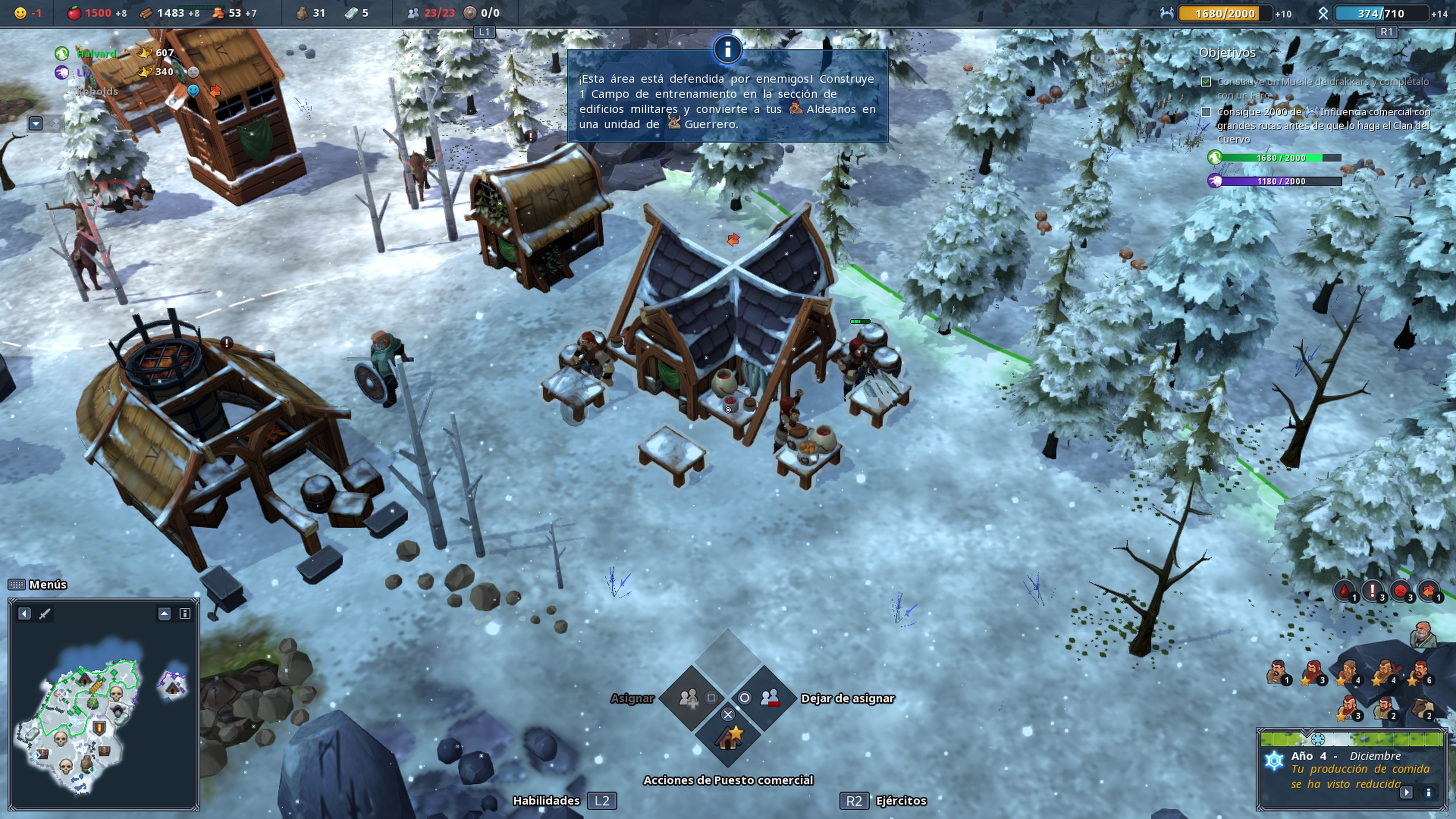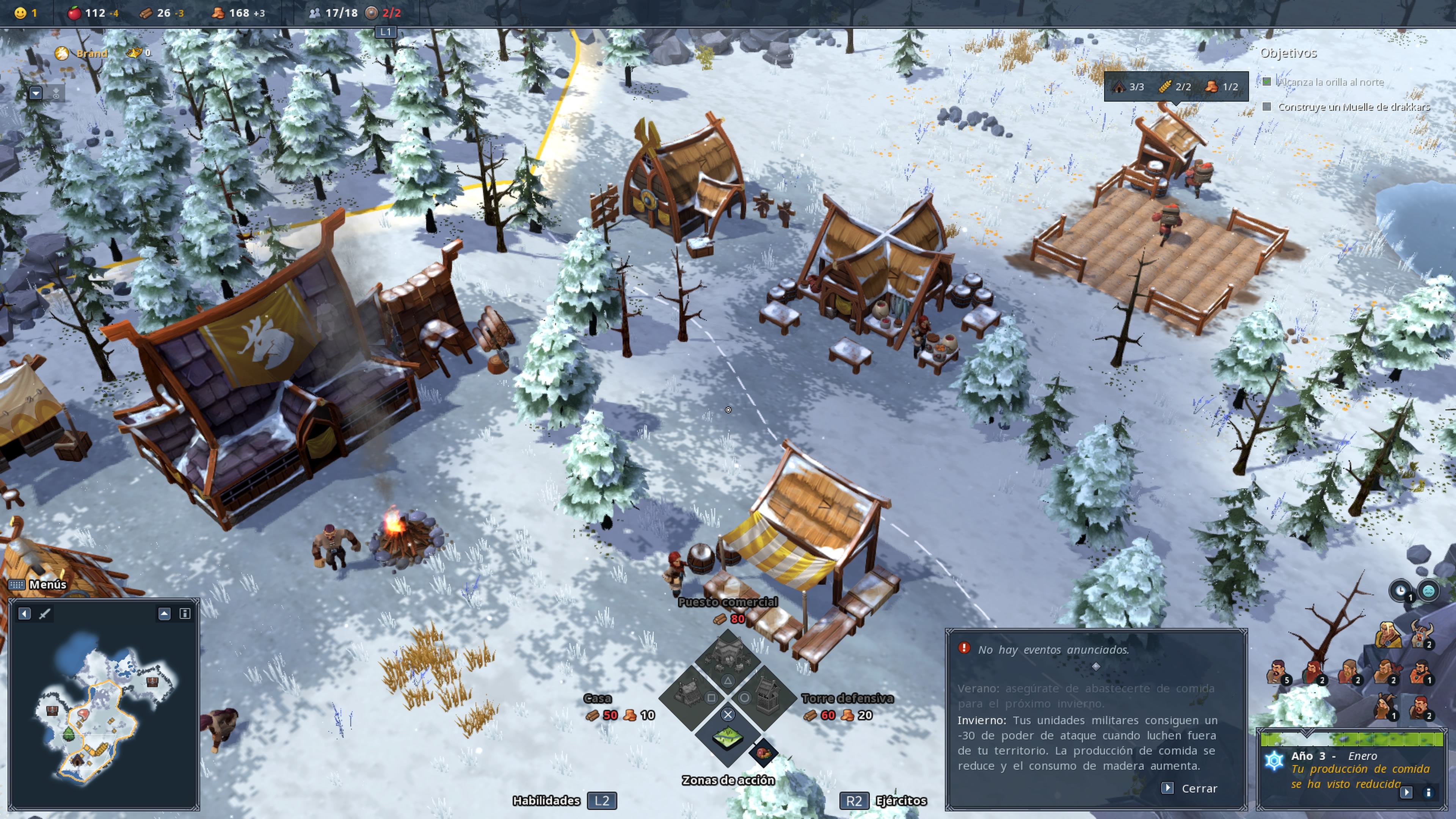 La forma de ganar la partida variara, podemos ir por la vía militar y crear un ejército para eliminar nuestros enemigos o bien a través de la vía comercial con un puerto de drakkars y tener buenas rutas comerciales o por fama. Debemos comentar ciertos aspectos de importancia, por ejemplo poder realizar festines que mejorar el rendimiento y felicidad de nuestros ciudadanos durante un periodo de tiempo, eventos que irán ocurriendo a lo largo del año como ataques, ventiscas o terremotos y para los que debemos estar preparados y estaciones o la llegada del invierno que nos penalizará de varias formas.