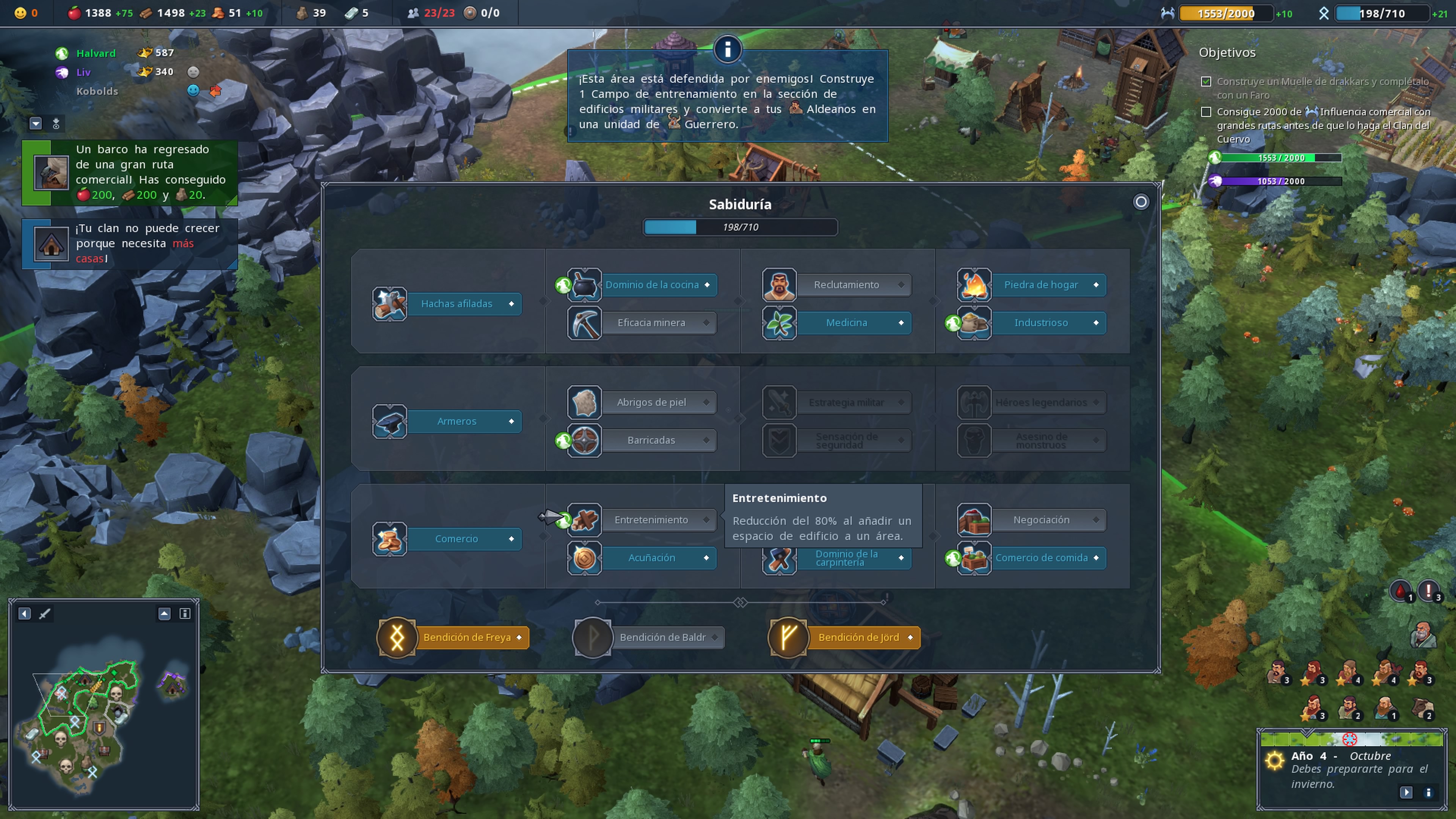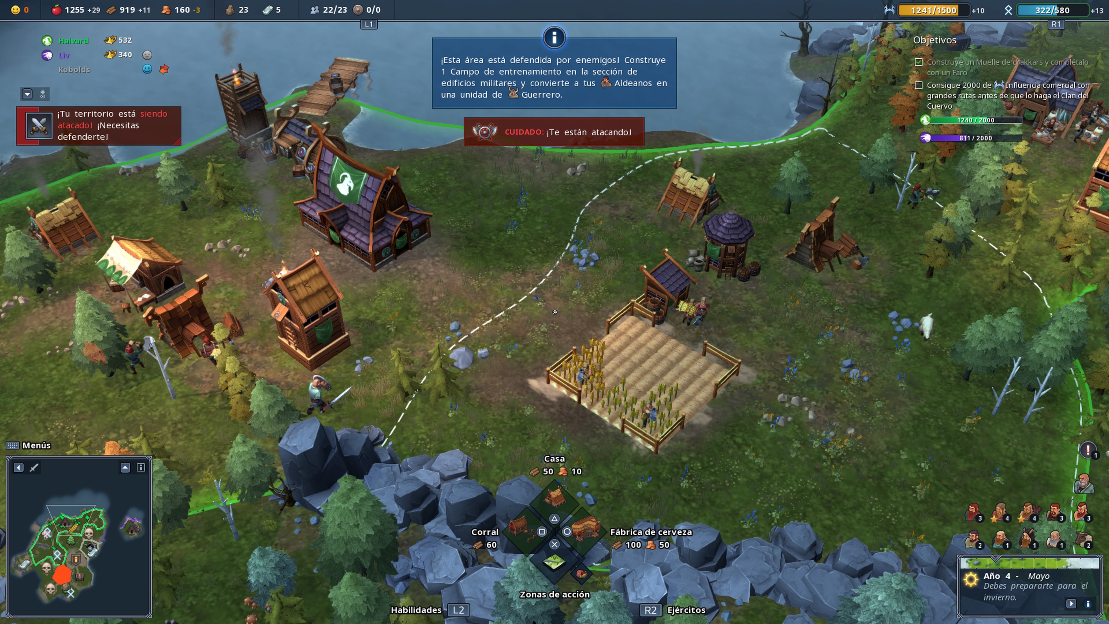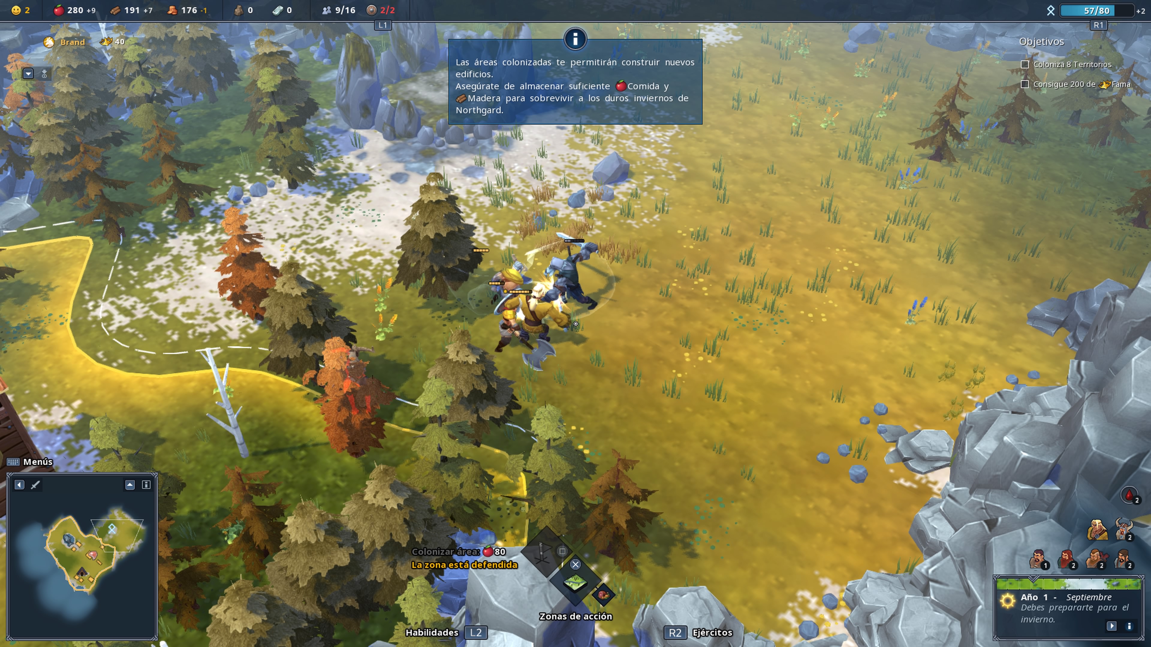 Colonizar nuevos terrenos se basa en tres procesos. Cuando comencemos cada partida, el mapa estará oculto y debemos destinar campesinos para que se conviertan en exploradores. Estos irán investigando el mapa y una vez hecho esto tendremos la posibilidad de colonizarlo gastando comida. Eso si, tendremos que limpiar esa zona de enemigos. Cada zona que vayamos consiguiendo nos irá costando cada vez más recursos, por lo que o tenemos un gran cantidad de comida o nos convendrá buscar los mejores terrenos.