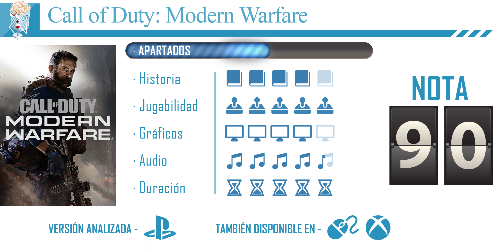 Tras el irregular, para algunos, de Call of Duty Black Ops 4 se ve como Infinity Ward ha buscando un estilo de juego más táctico y realista, sin soldados con superpoderes. Con esta entrega se ha apostado fuertemente por esta entrega, trayendo de vuelta un modo historia interesante y con una narrativa bastante atractiva. A esto se le una una jugabilidad muy dinámica y unos modos multijugador online con una diversidad bastante variada, donde cada jugador puede encontrar su modo predilecto. Call of Duty: Modern Warfare en, posiblemente, una de las entregas más sobresaliente de los últimos años de la franquicia; un título que ha sabido satisfacer por igual tanto al jugador individual como a aquel que busca disfrutar de su vertiente más competitiva y cooperativa.
